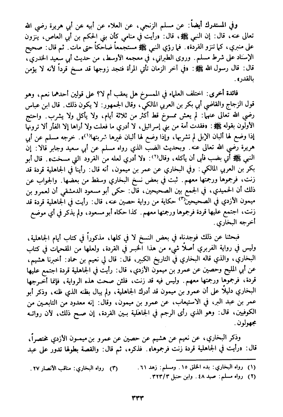 وذكر البخاري، عن نعيم عن هشيم عن حصين عن عمرو بن ميمون الأزدي مختصرا، قال: «رأيت في الجاهلية قردة زنت فرجموها» . فذكره، ثم قال: والقصة بطولها تدور على عبد