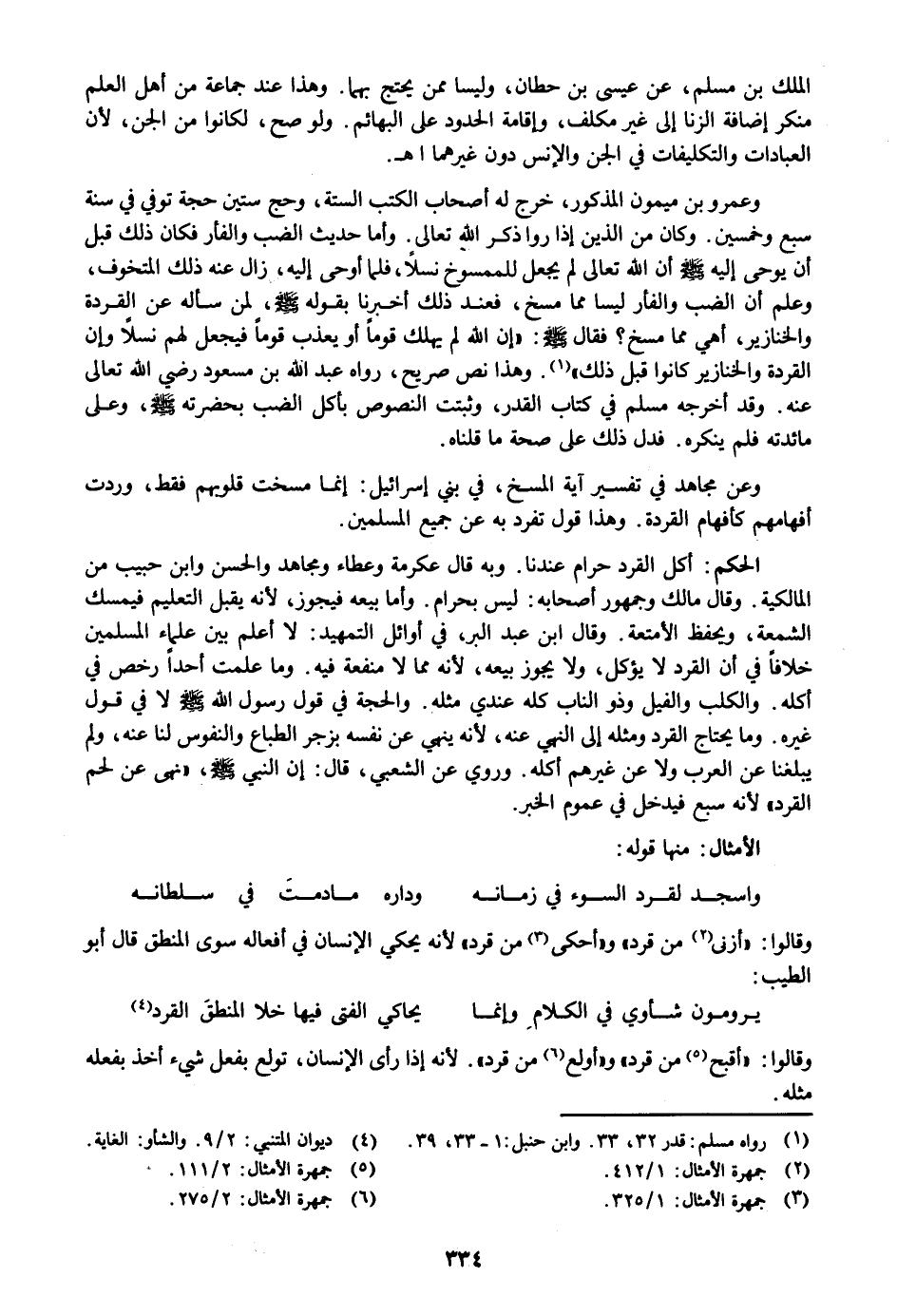 وعمرو بن ميمون المذكور، خرج له أصحاب الكتب الستة، وحج ستين حجة توفي في سنة سبع وخمسين. وكان من الذين إذا روا ذكر الله تعالى. وأما حديث الضب والفأر فكان ذلك قبل أن يوحى إليه صلى الله عليه وسلم أن الله تعالى لم يجعل للممسوخ نسلا، فلما أوحى إليه، زال عنه ذلك المتخوف، وعلم أن الضب والفأر ليسا مما مسخ، فعند ذلك أخبرنا بقوله صلى الله عليه وسلم، لمن سأله عن القردة والخنازير، أهي مما مسخ؟ فقال صلى الله عليه وسلم: «إن الله لم يهلك قوما أو يعذب قوما فيجعل لهم نسلا وإن القردة والخنازير كانوا قبل ذلك» «1» . وهذا نص صريح، رواه عبد الله بن مسعود رضي الله تعالى عنه. وقد أخرجه مسلم في كتاب القدر، وثبتت النصوص بأكل الضب بحضرته صلى الله عليه وسلم، وعلى مائدته فلم ينكره. فدل ذلك على صحة ما قلناه.