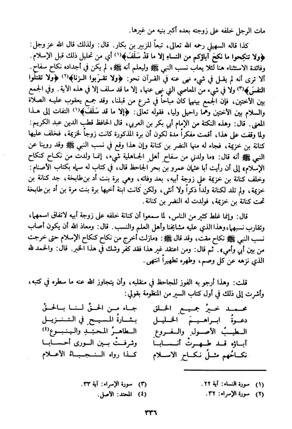 ولما وقفت على هذا، أقمت مفكرا مدة لكون أن برة المذكورة كانت زوجا لخزيمة، فخلف عليها كنانة بن خزيمة، فجاء له منها النضر بن كنانة وإن هذا وقع في نسب النبي صلى الله عليه وسلم وقد روينا عن النبي صلى الله عليه وسلم أنه قال: «ما ولدني من سفاح أهل الجاهلية شيء، إنما ولدت من نكاح كنكاح الإسلام» إلى أن رأيت أبا عثمان عمرو بن بحر الجاحظ قال، في كتاب له سماه بكتاب الأصنام: