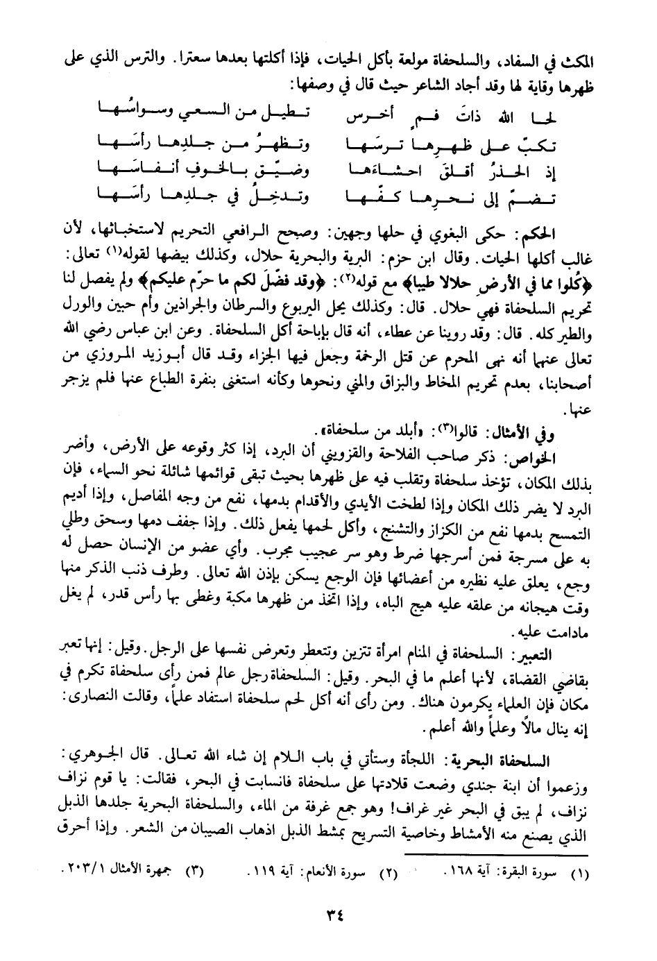 ولم يفصل لنا تحريم السلحفاة فهي حلال. قال: وكذلك يحل اليربوع والسرطان والجراذين وأم حبين والورل والطير كله. قال: وقد روينا عن عطاء، أنه قال بإباحة أكل السلحفاة. وعن ابن عباس رضي الله تعالى عنهما أنه نهى المحرم عن قتل الرخمة وجعل فيها الجزاء وقد قال أبو زيد المروزي من أصحابنا، بعدم تحريم المخاط والبزاق والمني ونحوها وكأنه استغنى بنفرة الطباع عنها فلم يزجر عنها.