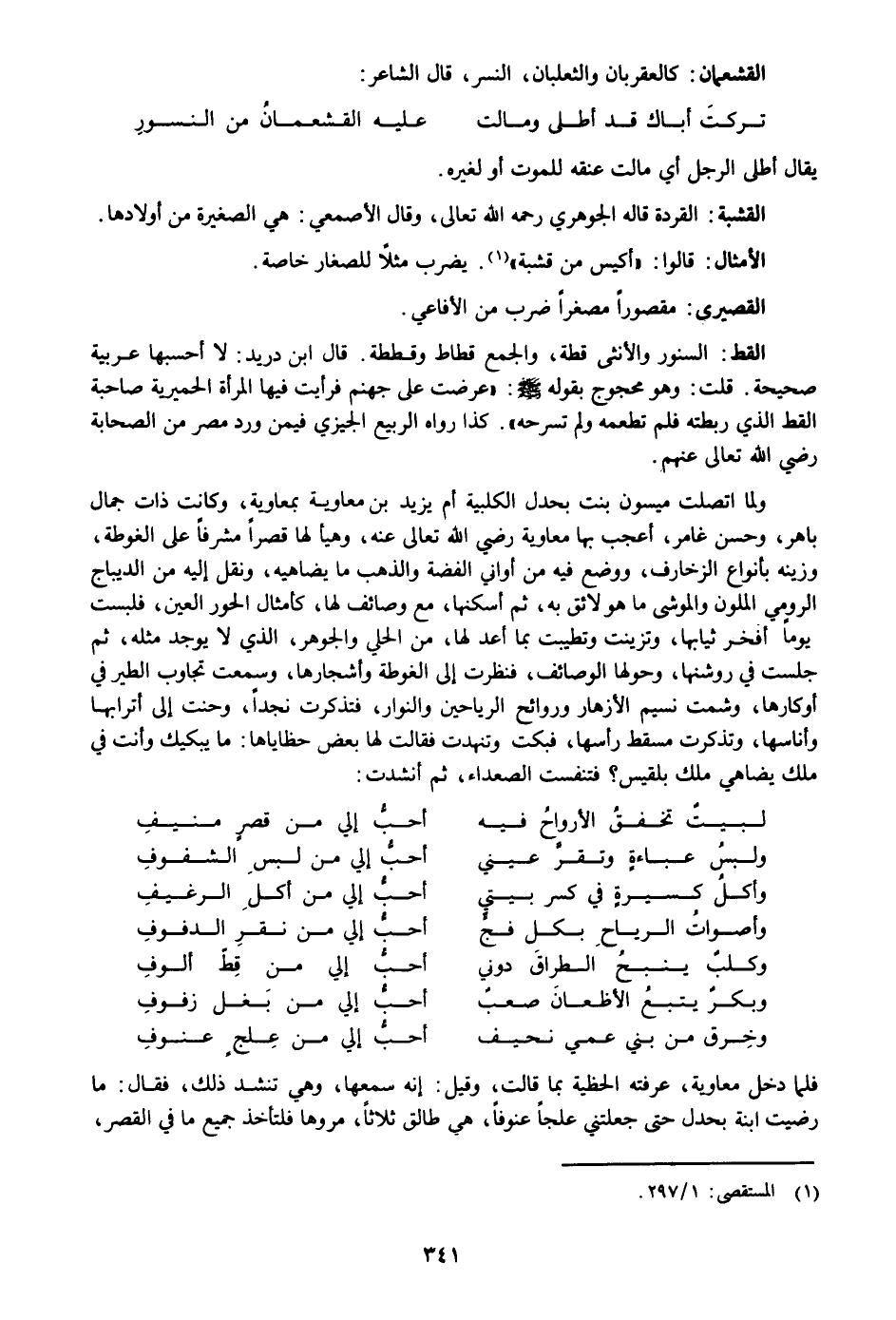 ولما اتصلت ميسون بنت بحدل الكلبية أم يزيد بن معاوية بمعاوية، وكانت ذات جمال باهر، وحسن غامر، أعجب بها معاوية رضي الله تعالى عنه، وهيأ لها قصرا مشرفا على الغوطة، وزينه بأنواع الزخارف، ووضع فيه من أواني الفضة والذهب ما يضاهيه، ونقل إليه من الديباج الرومي الملون والموشى ما هو لائق به، ثم أسكنها، مع وصائف لها، كأمثال الحور العين، فلبست يوما أفخر ثيابها، وتزينت وتطيبت بما أعد لها، من الحلي والجوهر، الذي لا يوجد مثله، ثم جلست في روشنها، وحولها الوصائف، فنظرت إلى الغوطة وأشجارها، وسمعت تجاوب الطير في أوكارها، وشمت نسيم الأزهار وروائح الرياحين والنوار، فتذكرت نجدا، وحنت إلى أترابها وأناسها، وتذكرت مسقط رأسها، فبكت وتنهدت فقالت لها بعض حظاياها: ما يبكيك وأنت في ملك يضاهي ملك بلقيس؟ فتنفست الصعداء، ثم أنشدت: