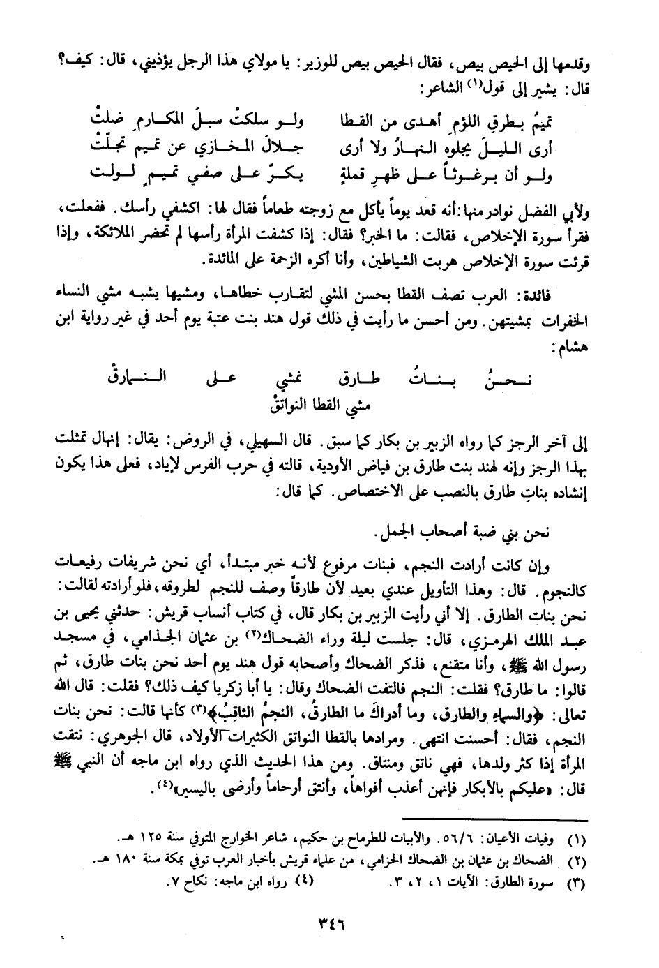 نحن بنات الطارق. إلا أني رأيت الزبير بن بكار قال، في كتاب أنساب قريش: حدثني يحيى بن عبد الملك الهرمزي، قال: جلست ليلة وراء الضحاك «2» بن عثمان الجذامي، في مسجد رسول الله صلى الله عليه وسلم، وأنا متقنع، فذكر الضحاك وأصحابه قول هند يوم أحد نحن بنات طارق، ثم قالوا: ما طارق؟ فقلت: النجم فالتفت الضحاك وقال: يا أبا زكريا كيف ذلك؟ فقلت: قال الله تعالى: وَالسَّماءِ وَالطَّارِقِ، وَما أَدْراكَ مَا الطَّارِقُ، النَّجْمُ الثَّاقِبُ
