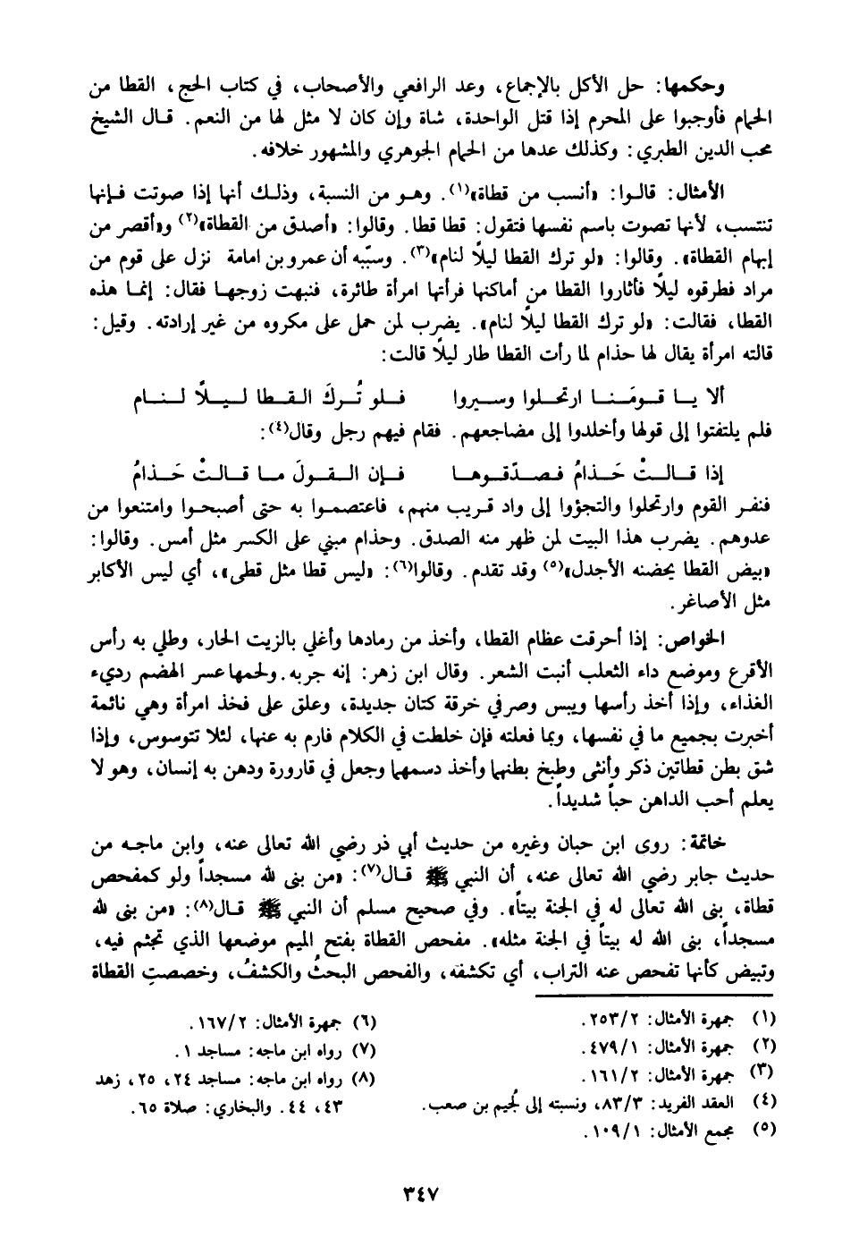 : قالوا: «أنسب من قطاة» «1» . وهو من النسبة، وذلك أنها إذا صوتت فإنها تنتسب، لأنها تصوت باسم نفسها فتقول: قطا قطا. وقالوا: «أصدق من القطاة» «2» و «أقصر من إبهام القطاة» . وقالوا: «لو ترك القطا ليلا لنام» «3» . وسبّبه أن عمرو بن امامة نزل على قوم من مراد فطرقوه ليلا فأثاروا القطا من أماكنها فرأتها امرأة طائرة، فنبهت زوجها فقال: إنما هذه القطا، فقالت: «لو ترك القطا ليلا لنام» . يضرب لمن حمل على مكروه من غير إرادته. وقيل: