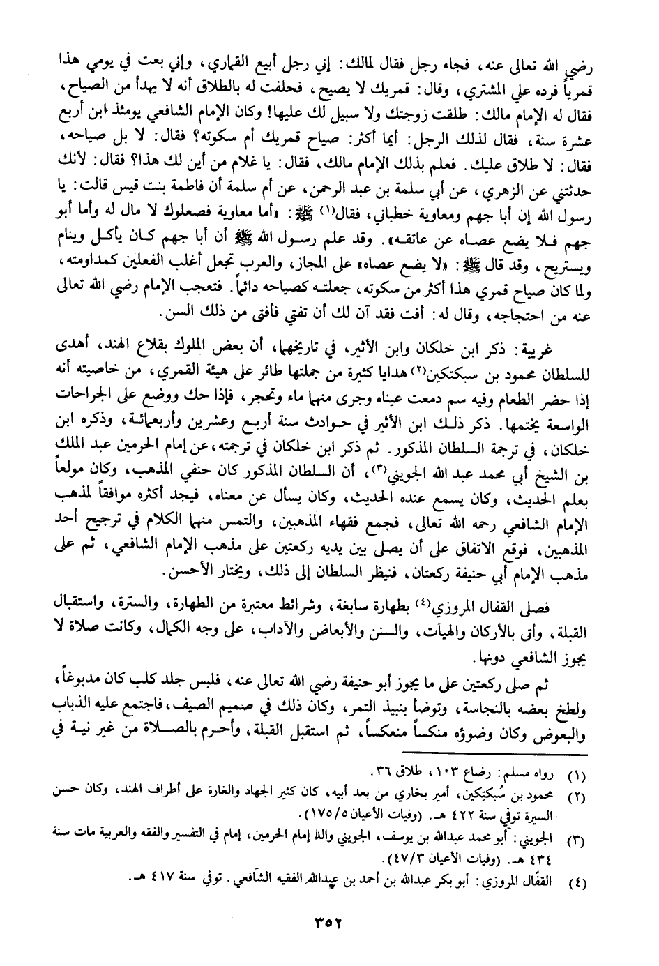 : ذكر ابن خلكان وابن الأثير، في تاريخهما، أن بعض الملوك بقلاع الهند، أهدى للسلطان محمود بن سبكتكين «2» هدايا كثيرة من جملتها طائر على هيئة القمري، من خاصيته أنه إذا حضر الطعام وفيه سم دمعت عيناه وجرى منهما ماء وتحجر، فإذا حك ووضع على الجراحات الواسعة يختمها. ذكر ذلك ابن الأثير في حوادث سنة أربع وعشرين وأربعمائة، وذكره ابن خلكان، في ترجمة السلطان المذكور. ثم ذكر ابن خلكان في ترجمته، عن إمام الحرمين عبد الملك بن الشيخ أبي محمد عبد الله الجويني «3» ، أن السلطان المذكور كان حنفي المذهب، وكان مولعا بعلم الحديث، وكان يسمع عنده الحديث، وكان يسأل عن معناه، فيجد أكثره موافقا لمذهب الإمام الشافعي رحمه الله تعالى، فجمع فقهاء المذهبين، والتمس منهما الكلام في ترجيح أحد المذهبين، فوقع الاتفاق على أن يصلى بين يديه ركعتين على مذهب الإمام الشافعي، ثم على مذهب الإمام أبي حنيفة ركعتان، فنيظر السلطان إلى ذلك، ويختار الأحسن.