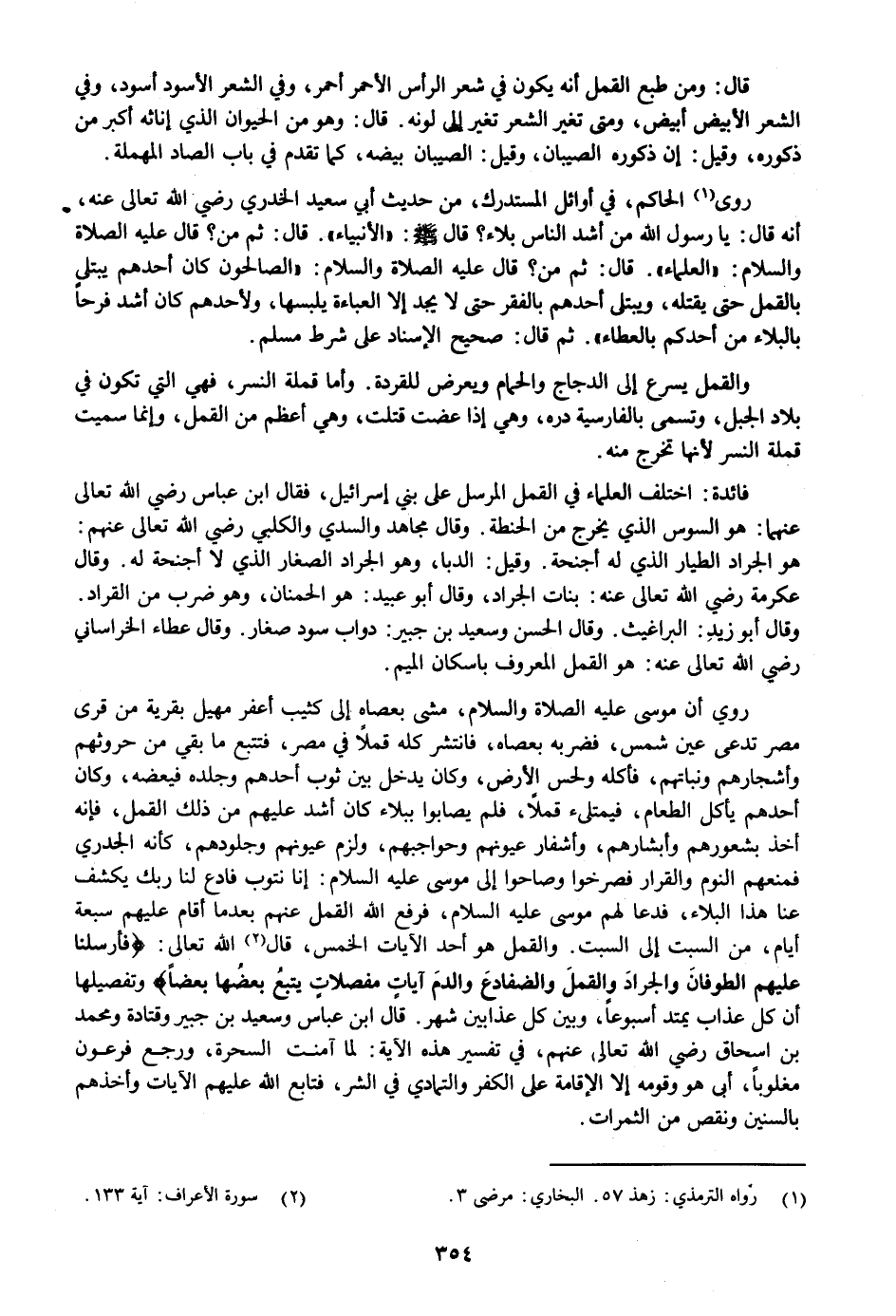 روي أن موسى عليه الصلاة والسلام، مشى بعصاه إلى كثيب أعفر مهيل بقرية من قرى مصر تدعى عين شمس، فضربه بعصاه، فانتشر كله قملا في مصر، فتتبع ما بقي من حروثهم وأشجارهم ونباتهم، فأكله ولحس الأرض، وكان يدخل بين ثوب أحدهم وجلده فيعضه، وكان أحدهم يأكل الطعام، فيمتلىء قملا، فلم يصابوا ببلاء كان أشد عليهم من ذلك القمل، فإنه أخذ بشعورهم وأبشارهم، وأشفار عيونهم وحواجبهم، ولزم عيونهم وجلودهم، كأنه الجدري فمنعهم النوم والقرار فصرخوا وصاحوا إلى موسى عليه السلام: إنا نتوب فادع لنا ربك يكشف عنا هذا البلاء، فدعا لهم موسى عليه السلام، فرفع الله القمل عنهم بعدما أقام عليهم سبعة أيام، من السبت إلى السبت. والقمل هو أحد الآيات الخمس، قال «2» الله تعالى: فَأَرْسَلْنا عَلَيْهِمُ الطُّوفانَ وَالْجَرادَ وَالْقُمَّلَ وَالضَّفادِعَ وَالدَّمَ آياتٍ مُفَصَّلاتٍ