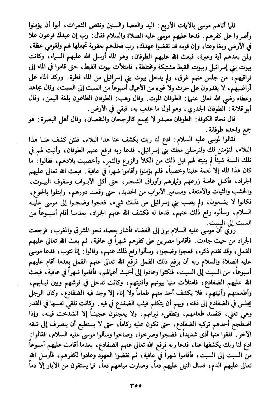 فلما أتاهم موسى بالآيات الأربع: اليد والعصا والسنين ونقص الثمرات، أبوا أن يؤمنوا وأصروا على كفرهم. فدعا عليهم موسى عليه الصلاة والسلام فقال: رب إن عبدك فرعون علا في الأرض وبغا وعتا، وإن قومه قد نقضوا عهدك، رب فخذهم بعقوبة تجعلها لهم ولقومي عظة، ولمن بعدهم آية وعبرة، فبعث الله عليهم الطوفان، وهو الماء أرسل الله عليهم السماء، وكانت بيوت بني إسرائيل وبيوت القبط مشتبكة ومختلطة، فامتلأت بيوت القبط، حتى قاموا في الماء إلى تراقيهم، من جلس منهم غرق، ولم يدخل بيوت بني إسرائيل من الماء قطرة. وركد الماء على أراضيهم، لا يقدرون على حرث ولا غيره من الأعمال أسبوعا من السبت إلى السبت، وقال مجاهد وعطاء رضي الله تعالى عنهما: الطوفان الموت. وقال وهب: الطوفان الطاعون بلغة اليمن، وقال أبو قلابة: الطوفان الجدري، وهو أول ما عذب به، فبقي في الأرض.