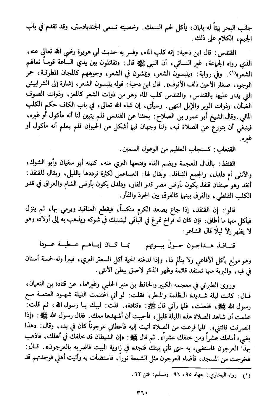 قال ابن دحية: إنه كلب الماء، وفسر به حديث أبي هريرة رضي الله تعالى عنه، الذي رواه الجماعة، غير النسائي، أن النبي صلى الله عليه وسلم قال: «تقاتلون بين يدي الساعة قوما نعالهم الشعر» «1» . وفي رواية: «يلبسون الشعر، ويمشون في الشعر، وجوههم كالمجان المطرقة، حمر الوجوه، صغار الأعين ذلف الأنوف» . قال ابن دحية: قوله يلبسون الشعر، إشارة إلى الشرابيش التي يدار عليها بالقندس، والقندس كلب الماء وهو من ذوات الشعر كالمعز، وذوات الصوف الضأن، وذوات الوبر والإبل انتهى. وسيأتي، إن شاء الله تعالى، في باب الكاف حكم الكلب المائي. وقال الشيخ أبو عمرو بن الصلاح: بحثنا عن القندس فلم يتبين لنا أنه مأكول أو غيره، فينبغي أن يتورع عن الصلاة فيه، ولنا وجهان فيما أشكل من الحيوان فلم يعلم أنه مأكول أو غيره.