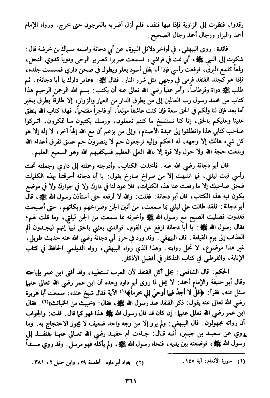 : قال الشافعي: يحل أكل القنفذ لأن العرب تستطيبه، وقد أفتى ابن عمر بإباحته وقال أبو حنيفة والإمام أحمد: لا يحل لما روى أبو داود وحده أن ابن عمر رضي الله تعالى عنهما سئل عنه، فقرأ: قُلْ لا أَجِدُ فِي ما أُوحِيَ إِلَيَّ مُحَرَّماً