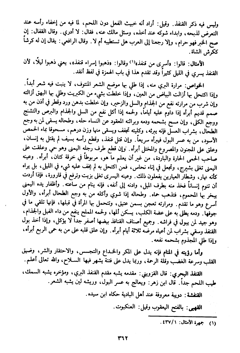 وليس فيه ذكر القنفذ. وقيل: أراد أنه خبيث الفعل دون اللحم، لما فيه من إخفاء رأسه عند التعرض لذبحه، وابداء شوكه عند أخذه، وسئل مالك عنه، فقال: لا أدري. وقال القفال: إن صح الخبر فهو حرام، وإلا رجعنا إلى العرب هل تستطيبه أم لا. وقال الرافعي: يقال إن له كرشا ككرش الشاة.