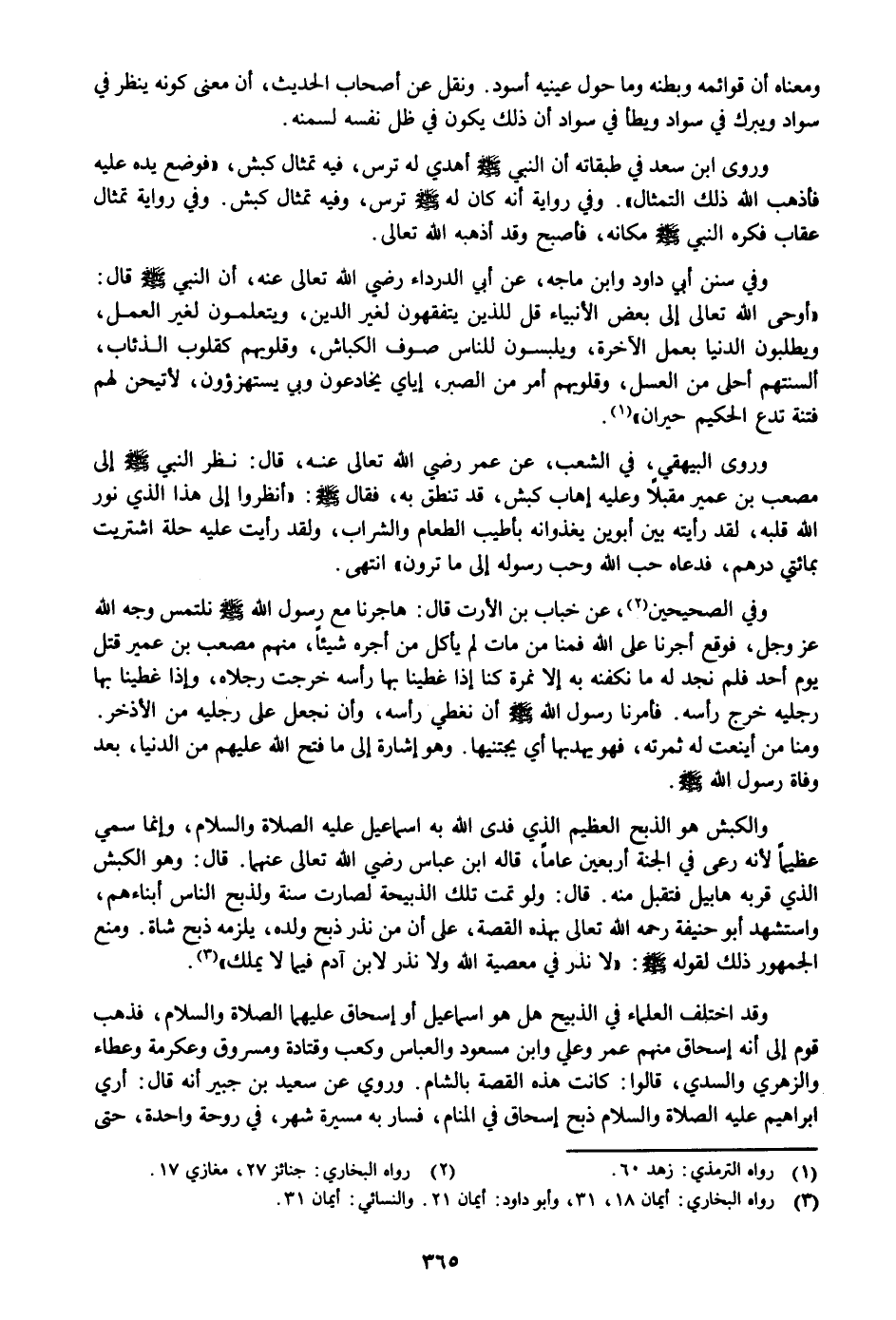 وروى البيهقي، في الشعب، عن عمر رضي الله تعالى عنه، قال: نظر النبي صلى الله عليه وسلم إلى مصعب بن عمير مقبلا وعليه إهاب كبش، قد تنطق به، فقال صلى الله عليه وسلم: «أنظروا إلى هذا الذي نور الله قلبه، لقد رأيته بين أبوين يغذوانه بأطيب الطعام والشراب، ولقد رأيت عليه حلة اشتريت بمائتي درهم، فدعاه حب الله وحب رسوله إلى ما ترون» انتهى.