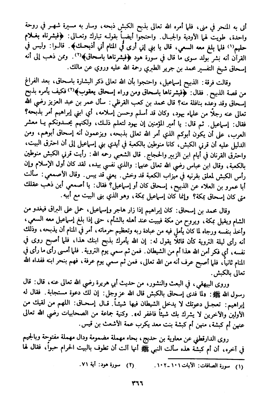 «3» فكيف يأمره بذبح إسحاق وقد وعده بنافلة منه؟ قال محمد بن كعب القرظي: سأل عمر بن عبد العزيز رضي الله تعالى عنه رجلا من علماء يهود، وكان قد أسلم وحسن إسلامه، أي ابني إبراهيم أمر بذبحه؟
