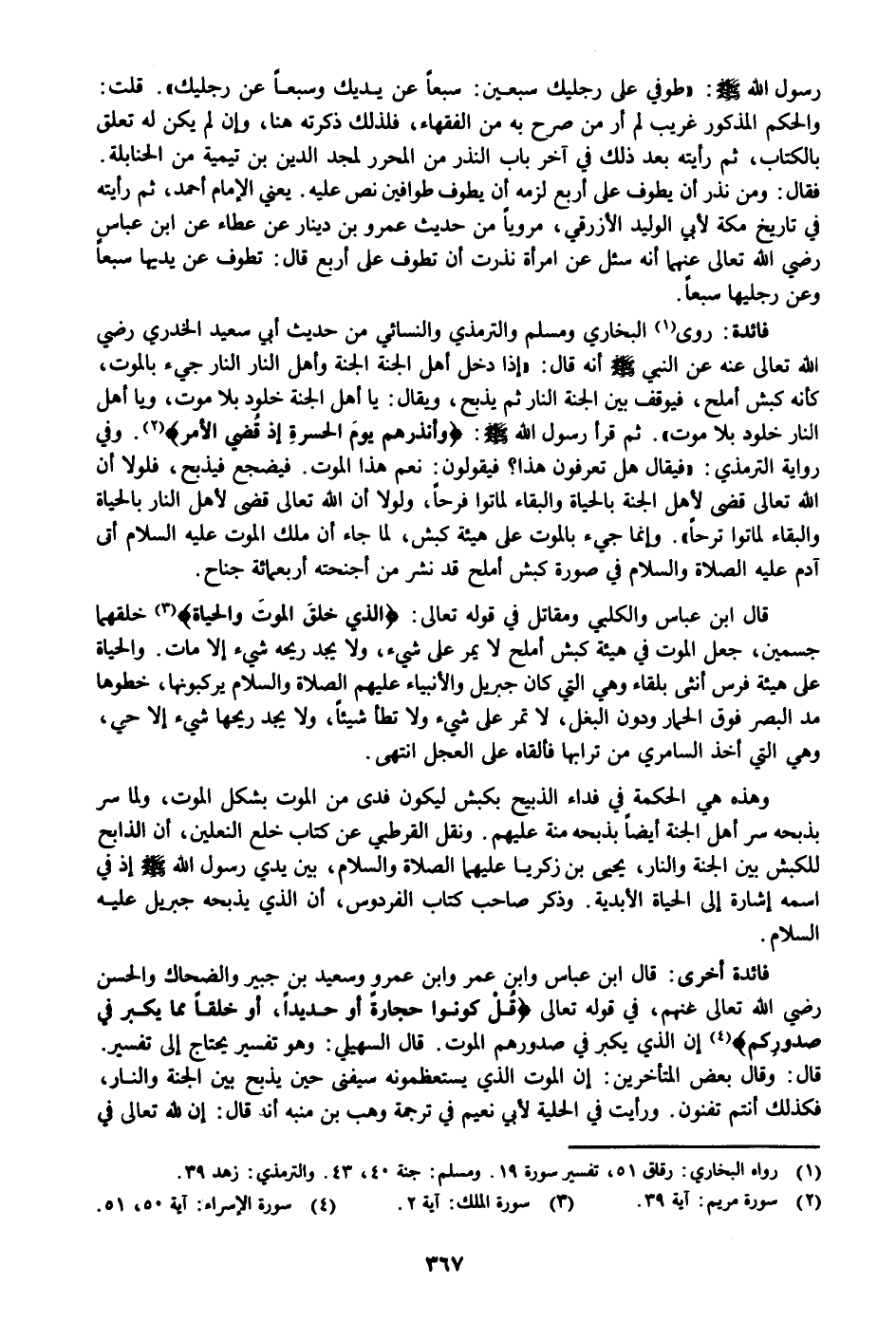 قال: وقال بعض المتأخرين: إن الموت الذي يستعظمونه سيفنى حين يذبح بين الجنة والنار، فكذلك أنتم تفنون. ورأيت في الحلية لأبي نعيم في ترجمة وهب بن منبه أنه قال: إن لله تعالى في