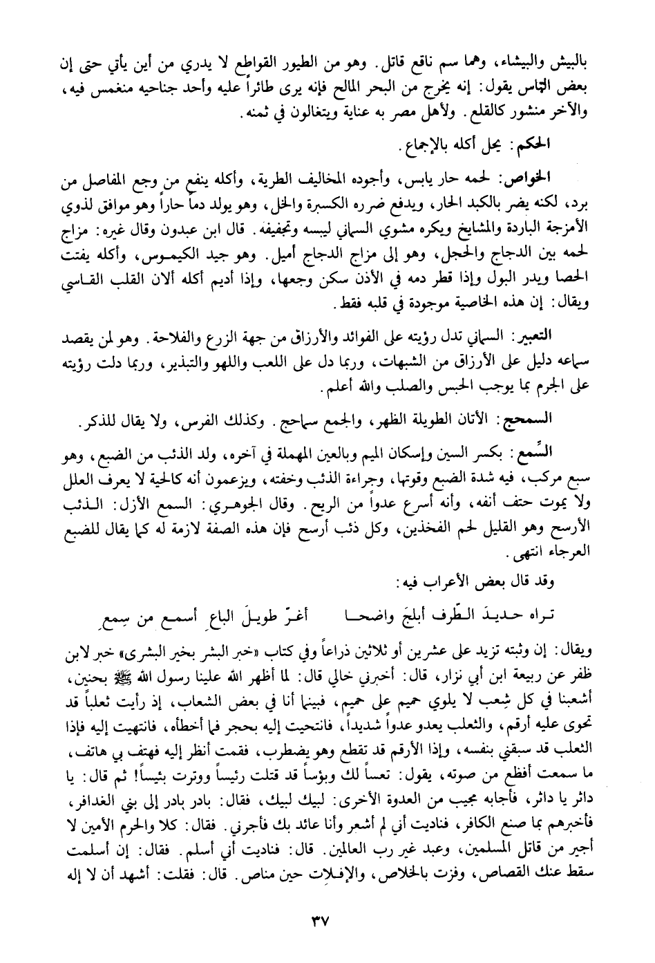 ويقال: إن وثبته تزيد على عشرين أو ثلاثين ذراعا وفي كتاب «خبر البشر بخير البشرى» خبر لابن ظفر عن ربيعة ابن أبي نزار، قال: أخبرني خالي قال: لما أظهر الله علينا رسول الله صلى الله عليه وسلم بحنين، أشعبنا في كل شعب لا يلوي حميم على حميم، فبينما أنا في بعض الشعاب، إذ رأيت ثعلبا قد تحوى عليه أرقم، والثعلب يعدو عدوا شديدا، فانتحيت إليه بحجر فما أخطأه، فانتهيت إليه فإذا الثعلب قد سبقني بنفسه، وإذا الأرقم قد تقطع وهو يضطرب، فقمت أنظر إليه فهتف بي هاتف، ما سمعت أفظع من صوته، يقول: تعسا لك وبؤسا قد قتلت رئيسا ووترت بئيسا! ثم قال: يا داثر يا داثر، فأجابه مجيب من العدوة الأخرى: لبيك لبيك، فقال: بادر بادر إلى بني الغدافر، فأخبرهم بما صنع الكافر، فناديت أني لم أشعر وأنا عائد بك فأجرني. فقال: كلا والحرم الأمين لا أجير من قاتل المسلمين، وعبد غير رب العالمين. قال: فناديت أني أسلم. فقال: إن أسلمت سقط عنك القصاص، وفزت بالخلاص، والإفلات حين مناص. قال: فقلت: أشهد أن لا إله