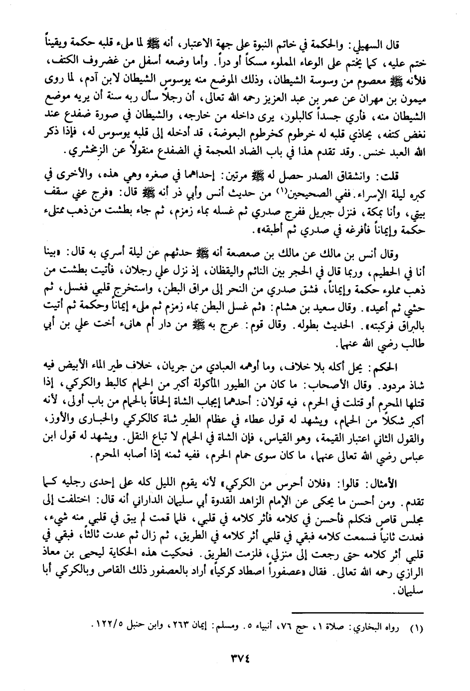 قال السهيلي: والحكمة في خاتم النبوة على جهة الاعتبار، أنه صلى الله عليه وسلم لما ملىء قلبه حكمة ويقينا ختم عليه، كما يختم على الوعاء المملوء مسكا أو درا. وأما وضعه أسفل من غضروف الكتف، فلأنه صلى الله عليه وسلم معصوم من وسوسة الشيطان، وذلك الموضع منه يوسوس الشيطان لابن آدم، لما روى ميمون بن مهران عن عمر بن عبد العزيز رحمه الله تعالى، أن رجلا سأل ربه سنة أن يريه موضع الشيطان منه، فأري جسدا كالبلور، يرى داخله من خارجه، والشيطان في صورة ضفدع عند نغض كتفه، يحاذي قلبه له خرطوم كخرطوم البعوضة، قد أدخله إلى قلبه يوسوس له، فإذا ذكر الله العبد خنس. وقد تقدم هذا في باب الضاد المعجمة في الضفدع منقولا عن الزمخشري.