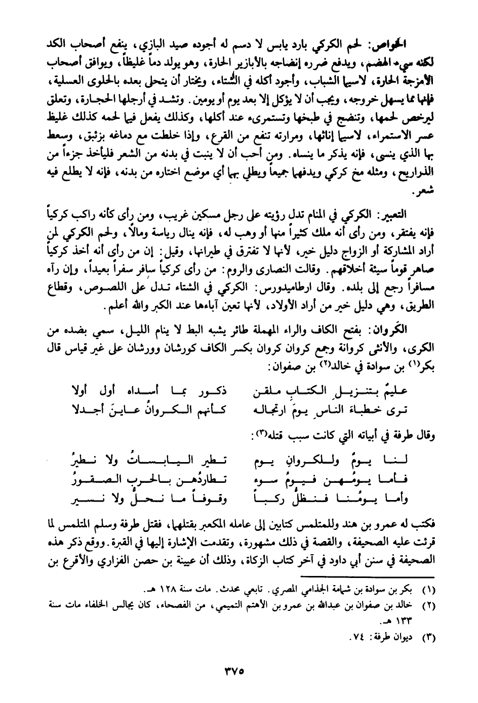 بفتح الكاف والراء المهملة طائر يشبه البط لا ينام الليل، سمي بضده من الكرى، والأنثى كروانة وجمع كروان كروان بكسر الكاف كورشان وورشان على غير قياس قال بكر «1» بن سوادة في خالد «2» بن صفوان: