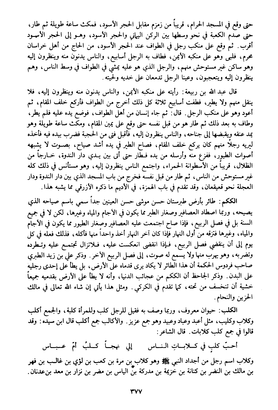 حتى وقع في المسجد الحرام، قريبا من زمزم مقابل الحجر الأسود، فمكث ساعة طويلة ثم طار، حتى صدم الكعبة في نحو وسطها بين الركن اليماني والحجر الأسود، وهو إلى الحجر الأسود أقرب. ثم وقع على منكب رجل في الطواف عند الحجر الأسود، من الحاج من أهل خراسان محرم، فلبى وهو على منكبه الأيمن، فطاف به الرجل أسابيع، والناس يدنون منه وينظرون إليه وهو ساكن غير مستوحش منهم، والرجل الذي هو عليه يمشي في الطواف في وسط الناس، وهم ينظرون إليه ويتعجبون، وعينا الرجل تدمعان على خديه ولحيته.