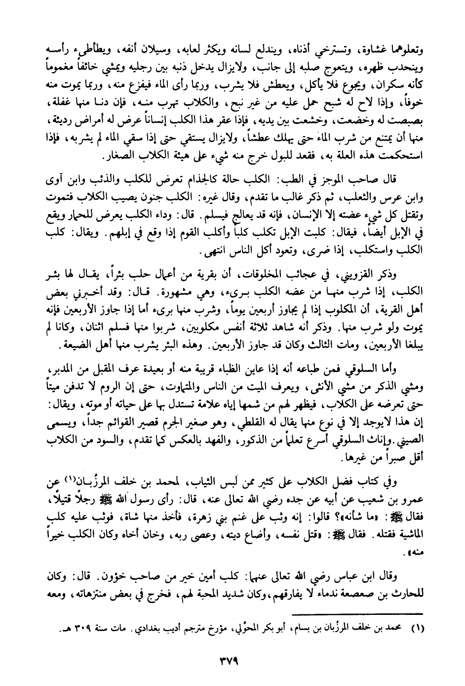 وفي كتاب فضل الكلاب على كثير ممن لبس الثياب، لمحمد بن خلف المرزبان «1» عن عمرو بن شعيب عن أبيه عن جده رضي الله تعالى عنه، قال: رأى رسول الله صلى الله عليه وسلم رجلا قتيلا، فقال صلى الله عليه وسلم: «ما شأنه» ؟ قالوا: إنه وثب على غنم بني زهرة، فأخذ منها شاة، فوثب عليه كلب الماشية فقتله. فقال صلى الله عليه وسلم: «قتل نفسه، وأضاع ديته، وعصى ربه، وخان أخاه وكان الكلب خيرا منه» .