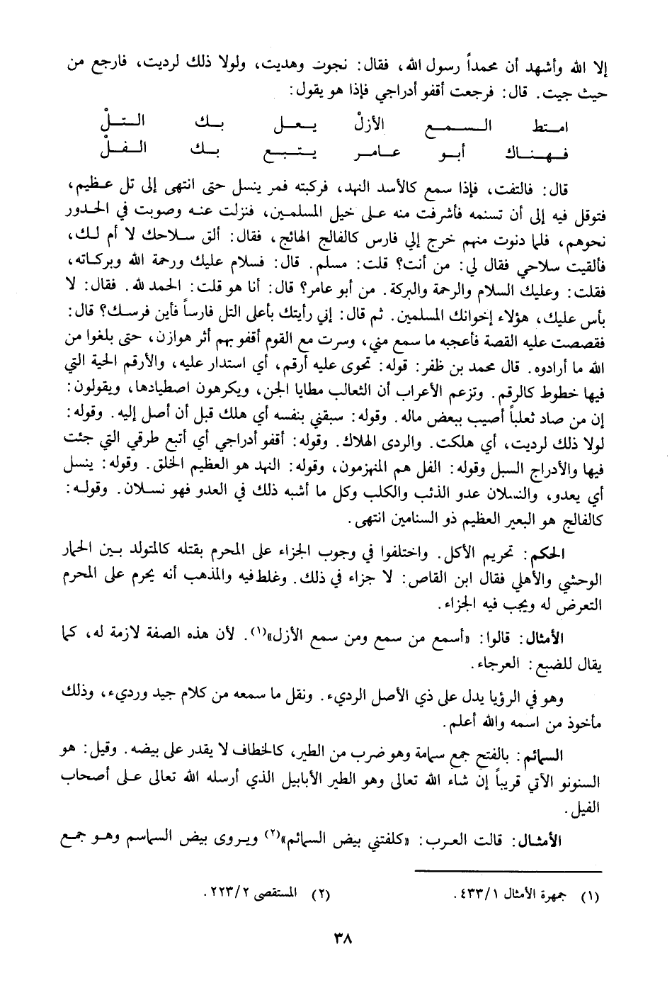 فقصصت عليه القصة فأعجبه ما سمع مني، وسرت مع القوم أقفو بهم أثر هوازن، حتى بلغوا من الله ما أرادوه. قال محمد بن ظفر: قوله: تحوى عليه أرقم، أي استدار عليه، والأرقم الحية التي فيها خطوط كالرقم. وتزعم الأعراب أن الثعالب مطايا الجن، ويكرهون اصطيادها، ويقولون: