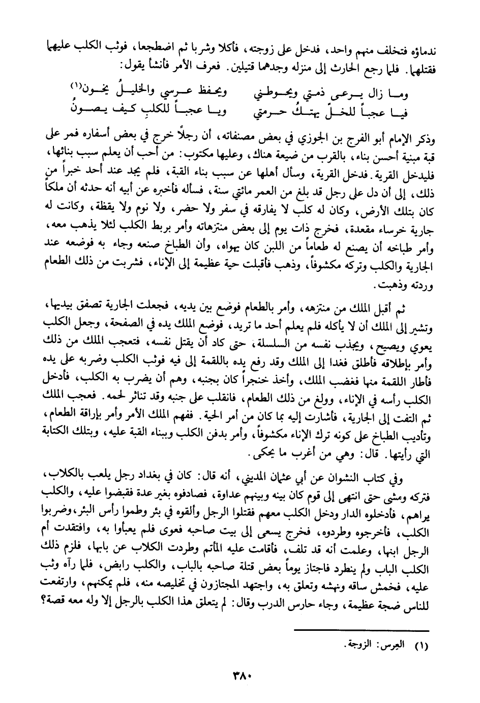 وفي كتاب النشوان عن أبي عثمان المديني، أنه قال: كان في بغداد رجل يلعب بالكلاب، فتركه ومشى حتى انتهى إلى قوم كان بينه وبينهم عداوة، فصادفوه بغير عدة فقبضوا عليه، والكلب يراهم، فأدخلوه الدار ودخل الكلب معهم فقتلوا الرجل وألقوه في بئر وطموا رأس البئر، وضربوا الكلب، فأخرجوه وطردوه، فخرج يسعى إلى بيت صاحبه فعوى فلم يعبأوا به، وافتقدت أم الرجل ابنها، وعلمت أنه قد تلف، فأقامت عليه المأتم وطردت الكلاب عن بابها، فلزم ذلك الكلب الباب ولم ينطرد فاجتاز يوما بعض قتلة صاحبه بالباب، والكلب رابض، فلما رآه وثب عليه، فخمش ساقه ونهشه وتعلق به، واجتهد المجتازون في تخليصه منه، فلم يمكنهم، وارتفعت للناس ضجة عظيمة، وجاء حارس الدرب وقال: لم يتعلق هذا الكلب بالرجل إلا وله معه قصة؟
