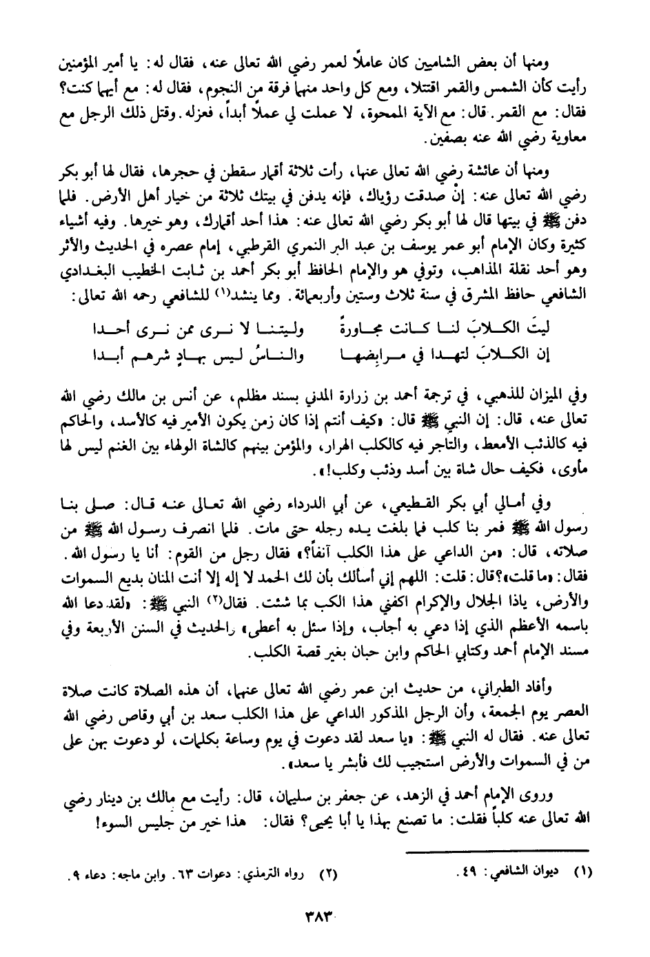 ومنها أن عائشة رضي الله تعالى عنها، رأت ثلاثة أقمار سقطن في حجرها، فقال لها أبو بكر رضي الله تعالى عنه: إن صدقت رؤياك، فإنه يدفن في بيتك ثلاثة من خيار أهل الأرض. فلما دفن صلى الله عليه وسلم في بيتها قال لها أبو بكر رضي الله تعالى عنه: هذا أحد أقمارك، وهو خيرها. وفيه أشياء كثيرة وكان الإمام أبو عمر يوسف بن عبد البر النمري القرطبي، إمام عصره في الحديث والأثر وهو أحد نقلة المذاهب، وتوفي هو والإمام الحافظ أبو بكر أحمد بن ثابت الخطيب البغدادي الشافعي حافظ المشرق في سنة ثلاث وستين وأربعمائة. ومما ينشد «1» للشافعي رحمه الله تعالى: