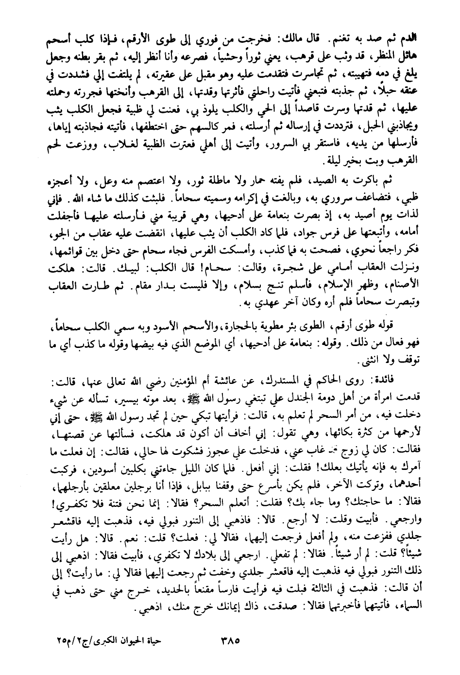 ثم باكرت به الصيد، فلم يفته حمار ولا ماطلة ثور، ولا اعتصم منه وعل، ولا أعجزه ظبي، فتضاعف سروري به، وبالغت في إكرامه وسميته سحاما. فلبثت كذلك ما شاء الله. فإني لذات يوم أصيد به، إذ بصرت بنعامة على أدحيها، وهي قريبة مني فأرسلته عليها فأجفلت أمامه، وأتبعتها على فرس جواد، فلما كاد الكلب أن يثب عليها، انقضت عليه عقاب من الجو، فكر راجعا نحوي، فصحت به فما كذب، وأمسكت الفرس فجاء سحام حتى دخل بين قوائمها، ونزلت العقاب أمامي على شجرة، وقالت: سحام! قال الكلب: لبيك. قالت: هلكت الأصنام، وظهر الإسلام، فأسلم تنج بسلام، وإلا فليست بدار مقام. ثم طارت العقاب وتبصرت سحاما فلم أره وكان آخر عهدي به.
