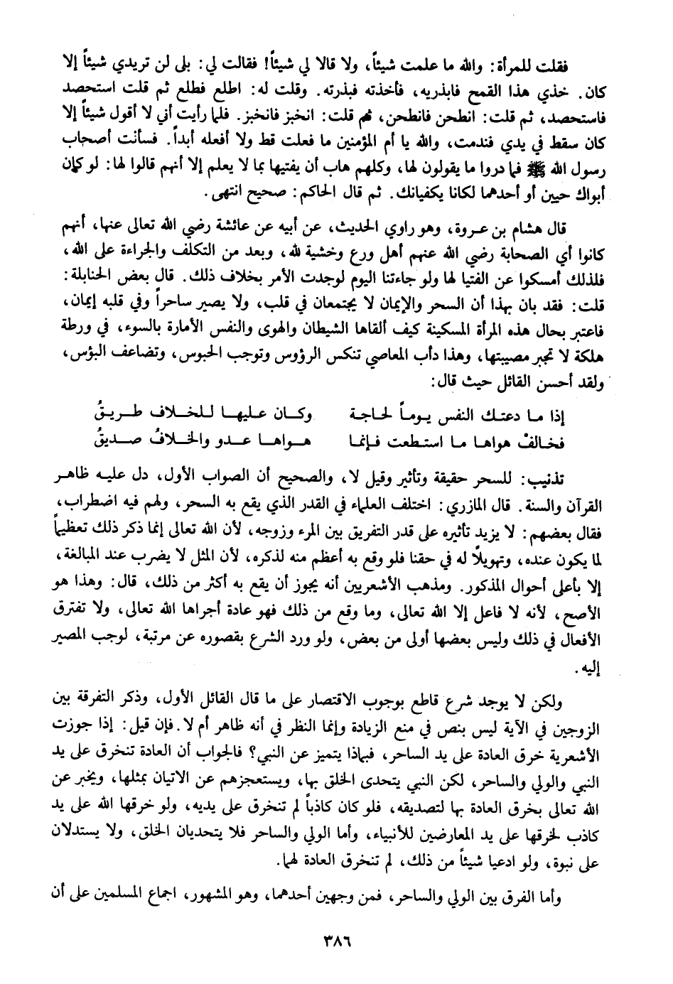 قلت: فقد بان بهذا أن السحر والإيمان لا يجتمعان في قلب، ولا يصير ساحرا وفي قلبه إيمان، فاعتبر بحال هذه المرأة المسكينة كيف ألقاها الشيطان والهوى والنفس الأمارة بالسوء، في ورطة هلكة لا تجبر مصيبتها، وهذا دأب المعاصي تنكس الرؤوس وتوجب الحبوس، وتضاعف البؤس، ولقد أحسن القائل حيث قال: