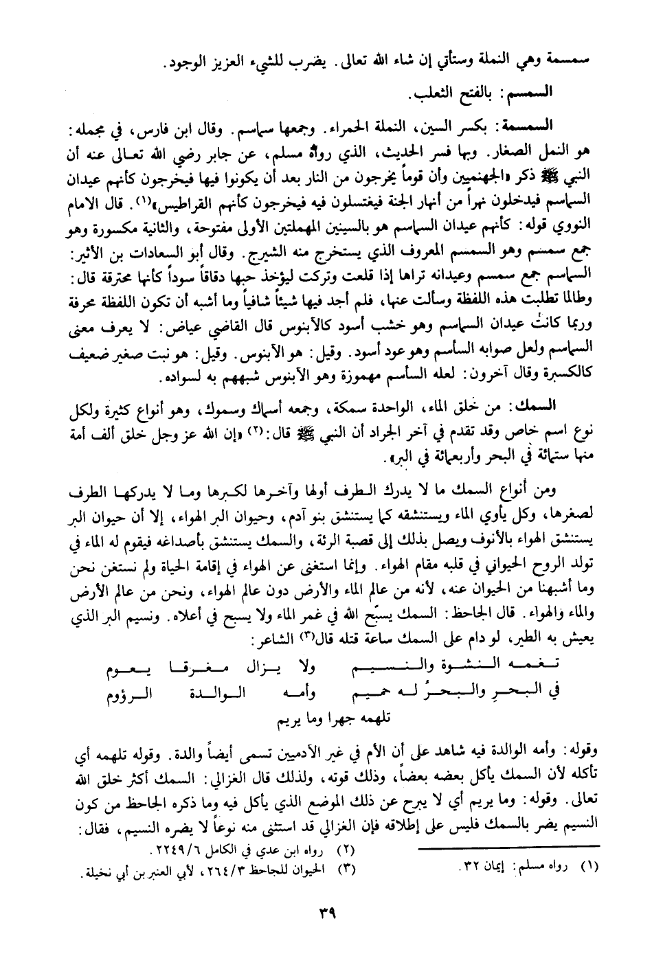 هو النمل الصغار. وبها فسر الحديث، الذي رواه مسلم، عن جابر رضي الله تعالى عنه أن النبي صلى الله عليه وسلم ذكر «الجهنميين وأن قوما يخرجون من النار بعد أن يكونوا فيها فيخرجون كأنهم عيدان السماسم فيدخلون نهرا من أنهار الجنة فيغتسلون فيه فيخرجون كأنهم القراطيس» «1» . قال الامام النووي قوله: كأنهم عيدان السماسم هو بالسينين المهملتين الأولى مفتوحة، والثانية مكسورة وهو جمع سمسم وهو السمسم المعروف الذي يستخرج منه الشيرج. وقال أبو السعادات بن الأثير: