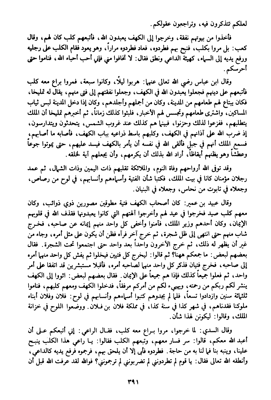 فأخذوا من بيوتهم نفقة، وخرجوا إلى الكهف يعبدون الله، فأتبعهم كلب كان لهم، وقال كعب: بل مروا بكلب، فنبح بهم فطردوه، فعاد فطردوه مرارا، وهو يعود فقام الكلب على رجليه ورفع يديه إلى السماء، كهيئة الداعي ونطق فقال: لا تخافوا مني فإني أحب أحباء الله، فناموا حتى أحرسكم.