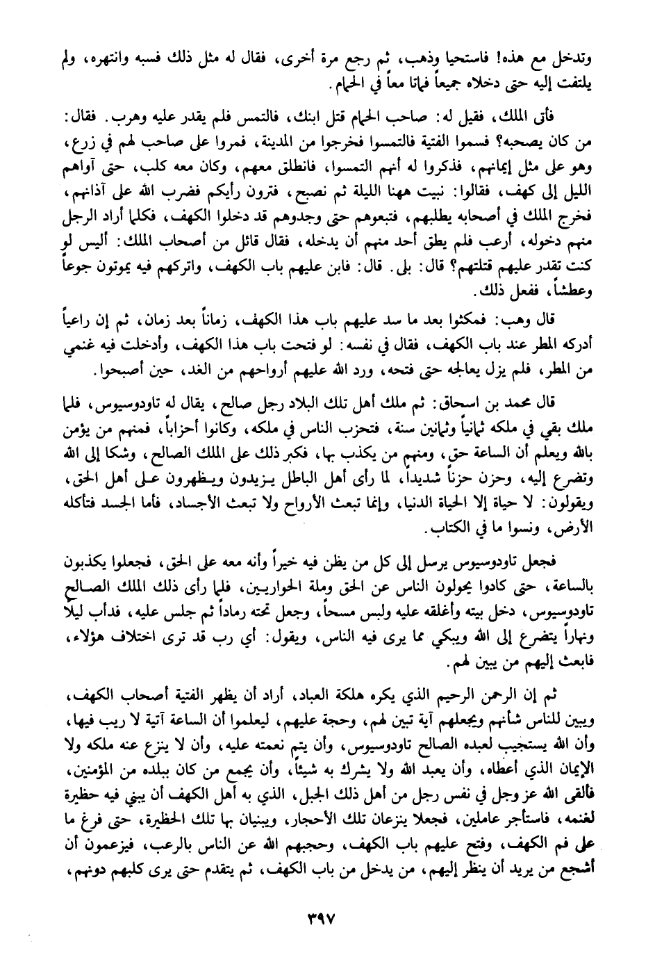 ثم إن الرحمن الرحيم الذي يكره هلكة العباد، أراد أن يظهر الفتية أصحاب الكهف، ويبين للناس شأنهم ويجعلهم آية تبين لهم، وحجة عليهم، ليعلموا أن الساعة آتية لا ريب فيها، وأن الله يستجيب لعبده الصالح تاودوسيوس، وأن يتم نعمته عليه، وأن لا ينزع عنه ملكه ولا الإيمان الذي أعطاه، وأن يعبد الله ولا يشرك به شيئا، وأن يجمع من كان ببلده من المؤمنين، فألقى الله عز وجل في نفس رجل من أهل ذلك الجبل، الذي به أهل الكهف أن يبني فيه حظيرة لغنمه، فاستأجر عاملين، فجعلا ينزعان تلك الأحجار، ويبنيان بها تلك الحظيرة، حتى فرغ ما على فم الكهف، وفتح عليهم باب الكهف، وحجبهم الله عن الناس بالرعب، فيزعمون أن أشجع من يريد أن ينظر إليهم، من يدخل من باب الكهف، ثم يتقدم حتى يرى كلبهم دونهم،