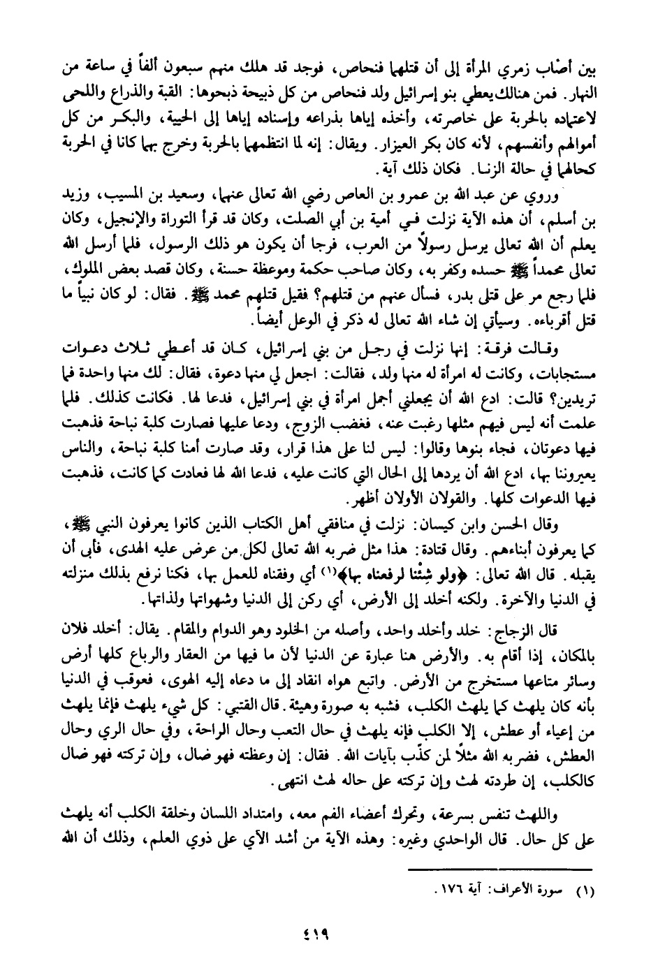 «1» أي وفقناه للعمل بها، فكنا نرفع بذلك منزلته في الدنيا والآخرة. ولكنه أخلد إلى الأرض، أي ركن إلى الدنيا وشهواتها ولذاتها.