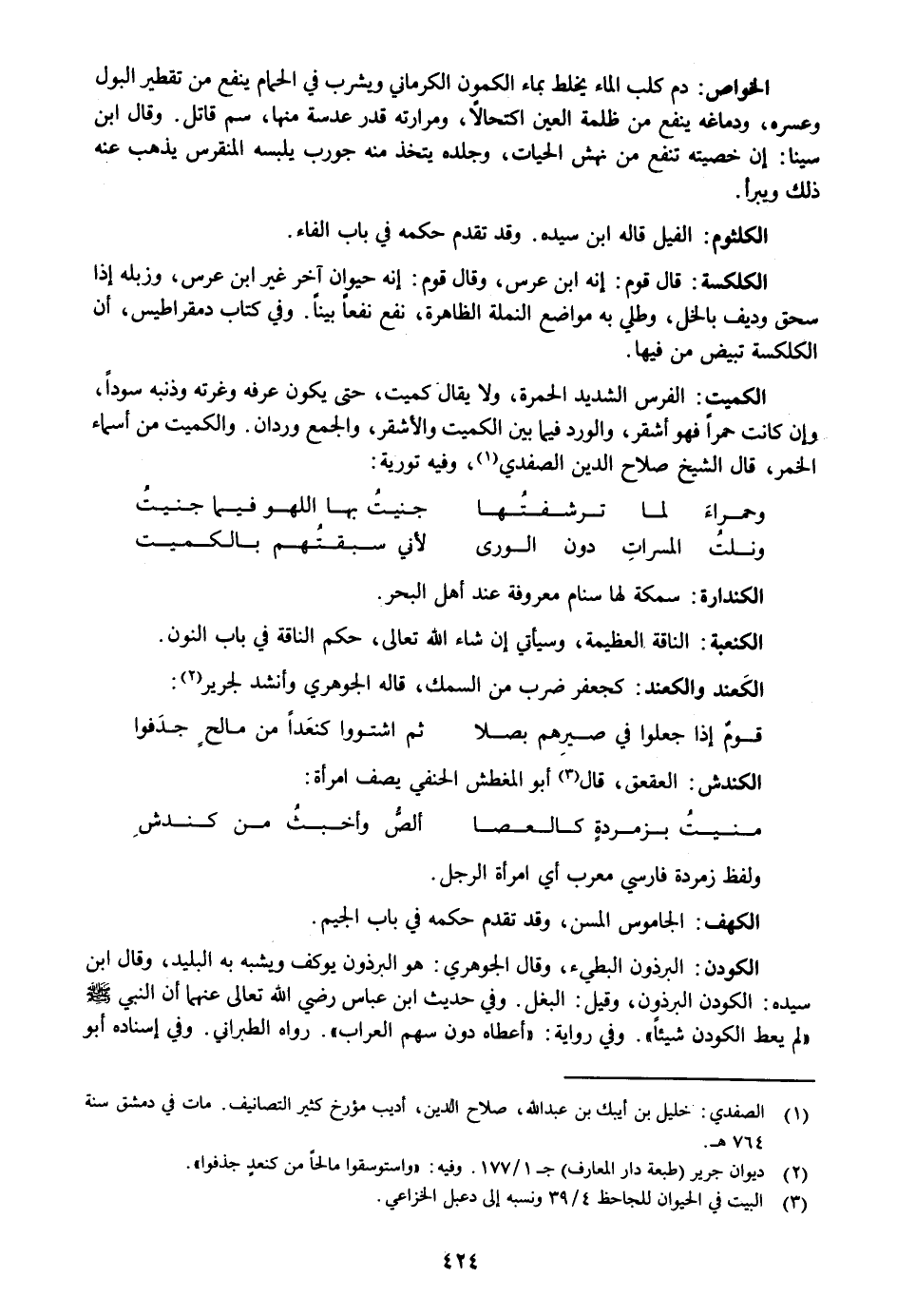 الفرس الشديد الحمرة، ولا يقال كميت، حتى يكون عرفه وغرته وذنبه سودا، وإن كانت حمرا فهو أشقر، والورد فيما بين الكميت والأشقر، والجمع وردان. والكميت من أسماء الخمر، قال الشيخ صلاح الدين الصفدي «1» ، وفيه تورية: