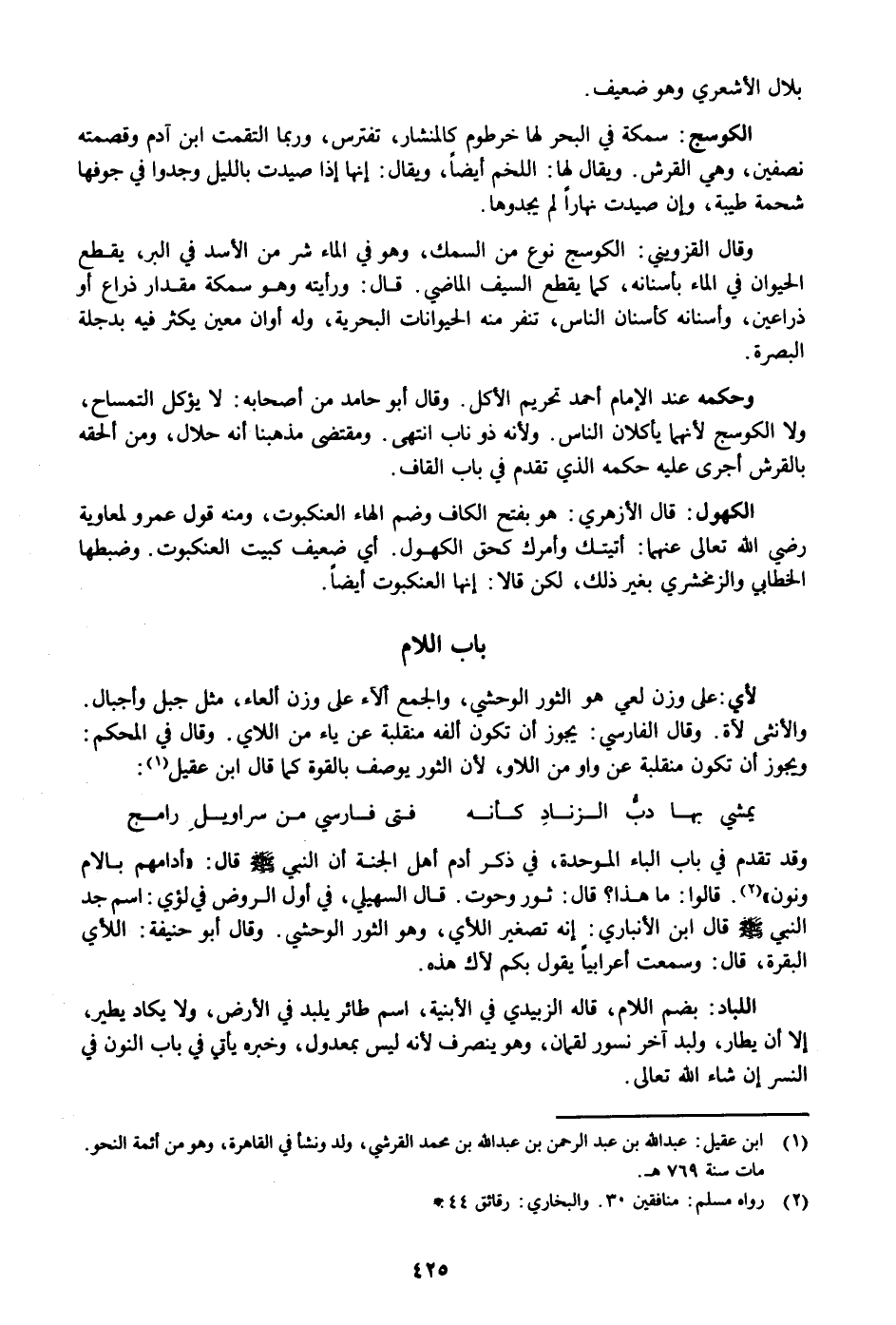 وقد تقدم في باب الباء الموحدة، في ذكر أدم أهل الجنة أن النبي صلى الله عليه وسلم قال: «أدامهم بالام ونون» «2» . قالوا: ما هذا؟ قال: ثور وحوت. قال السهيلي، في أول الروض في لؤي: اسم جد النبي صلى الله عليه وسلم قال ابن الأنباري: إنه تصغير اللأي، وهو الثور الوحشي. وقال أبو حنيفة: اللأي البقرة، قال: وسمعت أعرابيا يقول بكم لآك هذه.