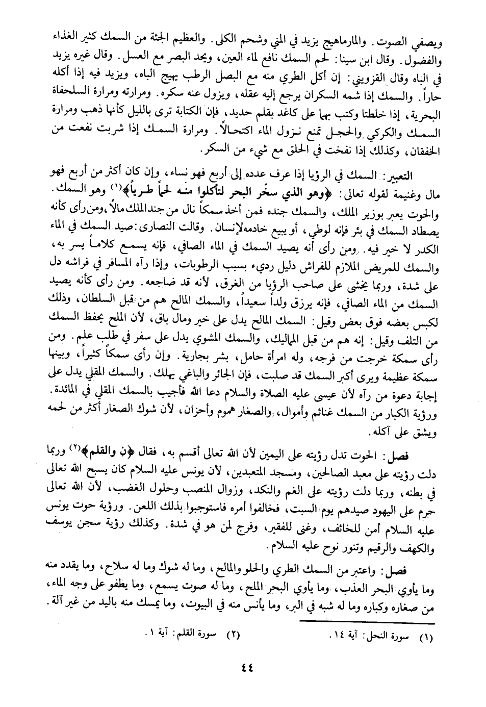«2» وربما دلت رؤيته على معبد الصالحين، ومسجد المتعبدين، لأن يونس عليه السلام كان يسبح الله تعالى في بطنه، وربما دلت رؤيته على الغم والنكد، وزوال المنصب وحلول الغضب، لأن الله تعالى حرم على اليهود صيدهم يوم السبت، فخالفوا أمره فاستوجبوا بذلك اللعن. ورؤية حوت يونس عليه السلام أمن للخائف، وغنى للفقير، وفرج لمن هو في شدة. وكذلك رؤية سجن يوسف والكهف والرقيم وتنور نوح عليه السلام.
