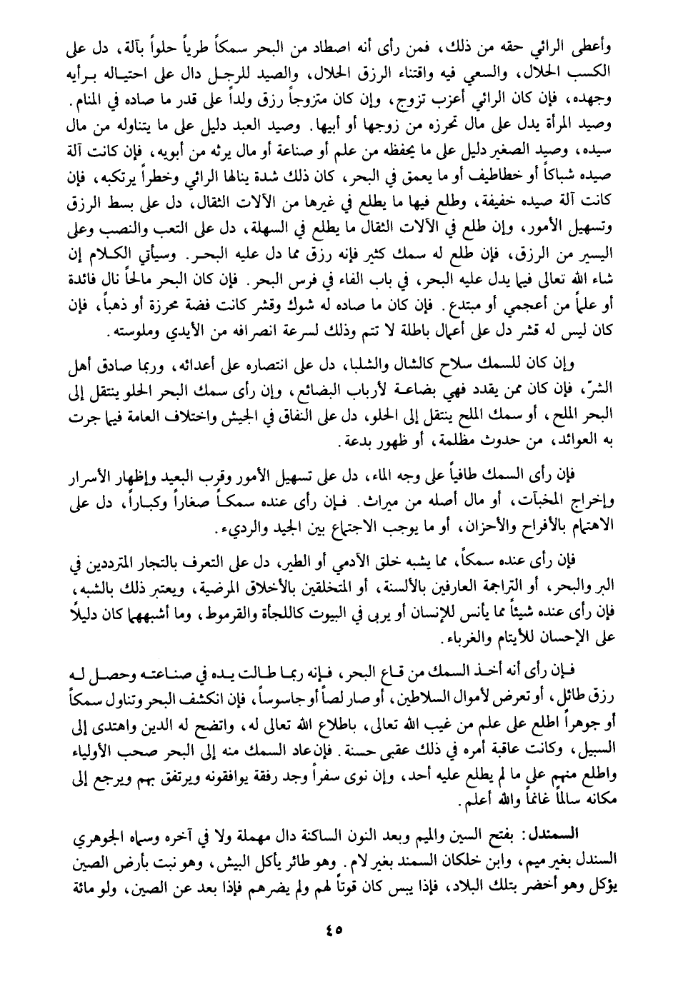فإن رأى أنه أخذ السمك من قاع البحر، فإنه ربما طالت يده في صناعته وحصل له رزق طائل، أو تعرض لأموال السلاطين، أو صار لصا أو جاسوسا، فإن انكشف البحر وتناول سمكا أو جوهرا اطلع على علم من غيب الله تعالى، باطلاع الله تعالى له، واتضح له الدين واهتدى إلى السبيل، وكانت عاقبة أمره في ذلك عقبى حسنة. فإن عاد السمك منه إلى البحر صحب الأولياء واطلع منهم على ما لم يطلع عليه أحد، وإن نوى سفرا وجد رفقة يوافقونه ويرتفق بهم ويرجع إلى مكانه سالما غانما والله أعلم.