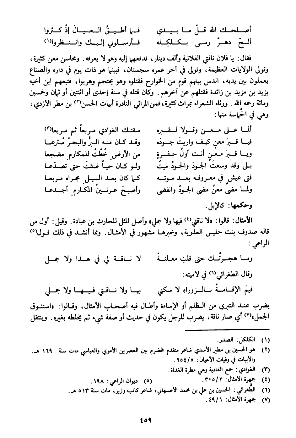 فقال: يا فلان ناقتي الفلانية وألف دينار، فدفعهما إليه وهو لا يعرفه. ومحاسن معن كثيرة، وتولى الولايات العظيمة، وتولى في آخر عمره سجستان، فبينما هو ذات يوم في داره والصناع يعملون بين يديه، اندس بينهم قوم من الخوارح فقتلوه وهو يحتجم وهربوا، فتبعهم ابن أخيه يزيد بن مزيد بن زائدة فقتلهم عن آخرهم. وكان قتله في سنة إحدى أو اثنتين أو ثمان وخمسين ومائة رحمه الله. ورثاه الشعراء بمراث كثيرة، فمن المراثي النادرة أبيات الحسن «2» بن مطر الأزدي، وهي في الحماسة منها:
