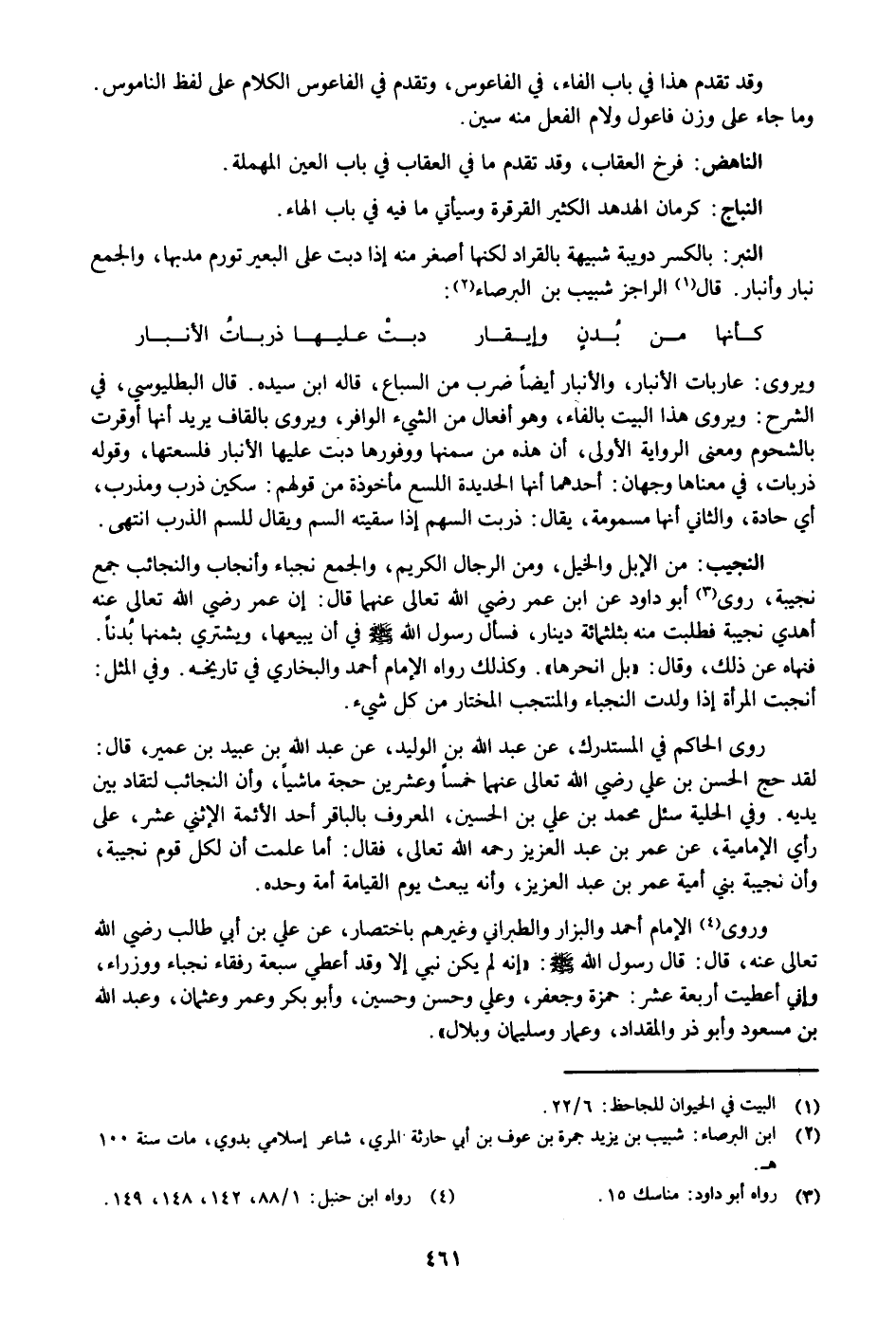 من الإبل والخيل، ومن الرجال الكريم، والجمع نجباء وأنجاب والنجائب جمع نجيبة، روى «3» أبو داود عن ابن عمر رضي الله تعالى عنهما قال: إن عمر رضي الله تعالى عنه أهدي نجيبة فطلبت منه بثلاثمائة دينار، فسأل رسول الله صلى الله عليه وسلم في أن يبيعها، ويشتري بثمنها بدنا.