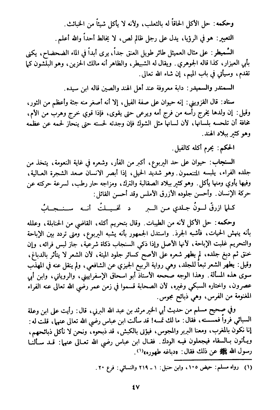 : حل الأكل لأنه من الطيبات. وقال بتحريم أكله، القاضي من الحنابلة، وعلله بأنه ينهش الحيات، فأشبه الجرذ. واستدل الجمهور بأنه يشبه اليربوع، ومتى تردد بين الإباحة والتحريم غلبت الإباحة، لأنها الأصل وإذا ذكي السنجاب ذكاة شرعية، جاز لبس فرائه، وإن خنق ثم دبغ جلده، لم يطهر شعره على الأصح كسائر جلود الميتة، لأن الشعر لا يتأثر بالدباغ، وقيل: يطهر الشعر تبعا للجلد، وهي رواية الربيع الجيزي عن الشافعي، ولم ينقل عنه في المهذب سوى هذه المسألة. وهذا الوجه صححه الأستاذ أبو اسحاق الإسفراييني، والروياني، وابن أبي عصرون، واختاره السبكي وغيره، لأن الصحابة قسموا في زمن عمر رضي الله تعالى عنه الفراء المغنومة من الفرس، وهي ذبائح مجوس.