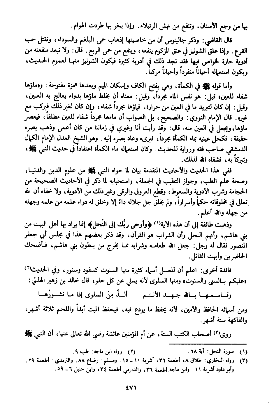 وأما قوله صلى الله عليه وسلم في الكمأة، وهي بفتح الكاف وإسكان الميم وبعدها همزة مفتوحة: و «ماؤها شفاء للعين» قيل: هو نفس الماء مجردا، وقيل: معناه أن يخلط ماؤها بدواء يعالج به العين، وقيل: إن كان لتبريد ما في العين من حرارة، فماؤها مجردا شفاء، وإن كان لغير ذلك فيركب مع غيره. قال الإمام النووي: والصحيح، بل الصواب أن ماءها مجردا شفاء للعين مطلقا، فيعصر ماؤها، ويجعل في العين منه. قال: وقد رأيت أنا وغيري في زماننا من كان أعمى وذهب بصره حقيقة، فكحل عينيه بماء الكمأة مجردا، فبرىء وعاد بصره إليه. وهو الشيخ العدل الإمام الكمال الدمشقي صاحب فقه ورواية للحديث. وكان استعماله ماء الكمأة اعتقادا في حديث النبي صلى الله عليه وسلم، وتبركا به، فشفاه الله لذلك.