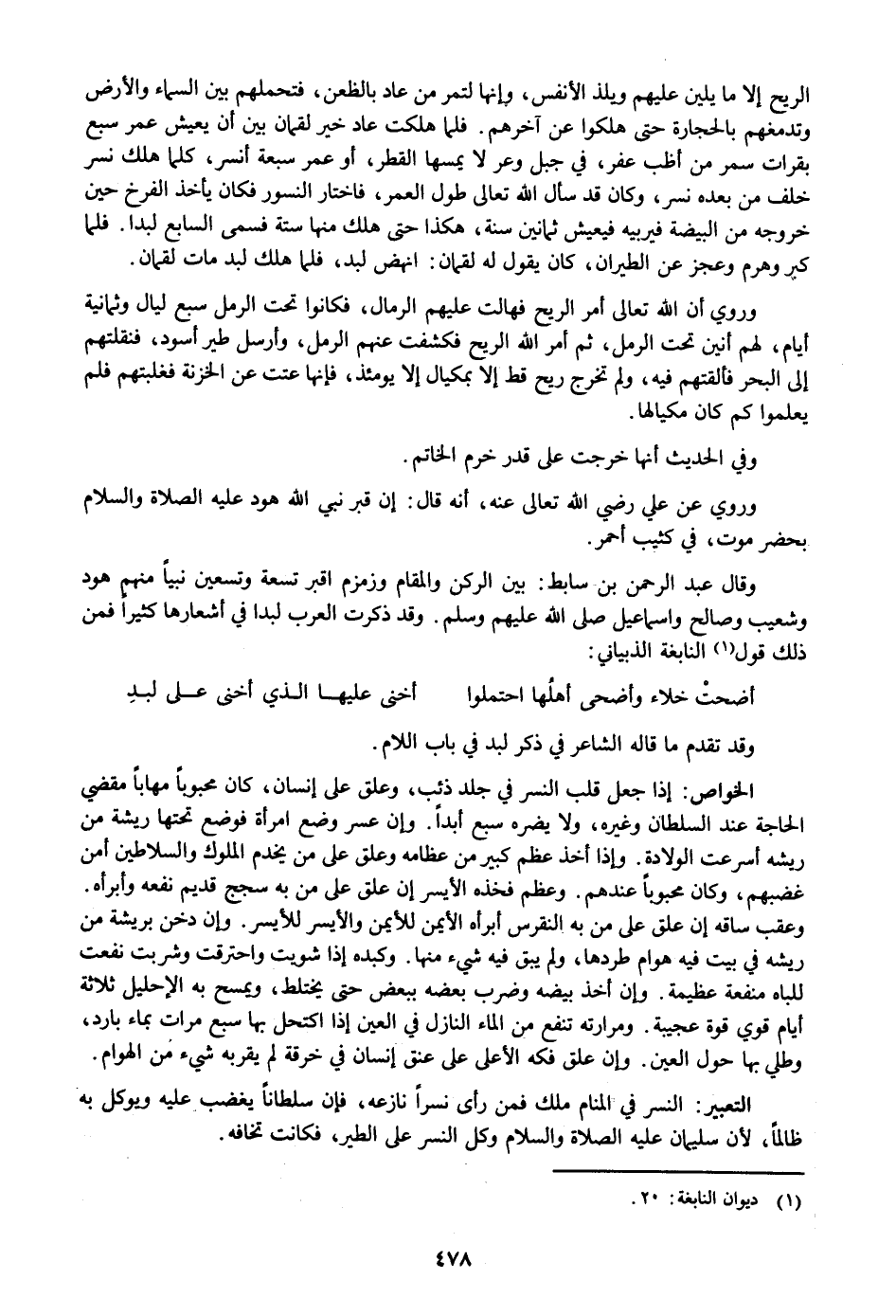 الريح إلا ما يلين عليهم ويلذ الأنفس، وإنها لتمر من عاد بالظعن، فتحملهم بين السماء والأرض وتدمغهم بالحجارة حتى هلكوا عن آخرهم. فلما هلكت عاد خير لقمان بين أن يعيش عمر سبع بقرات سمر من أظب عفر، في جبل وعر لا يمسها القطر، أو عمر سبعة أنسر، كلما هلك نسر خلف من بعده نسر، وكان قد سأل الله تعالى طول العمر، فاختار النسور فكان يأخذ الفرخ حين خروجه من البيضة فيربيه فيعيش ثمانين سنة، هكذا حتى هلك منها ستة فسمى السابع لبدا. فلما كبر وهرم وعجز عن الطيران، كان يقول له لقمان: انهض لبد، فلما هلك لبد مات لقمان.