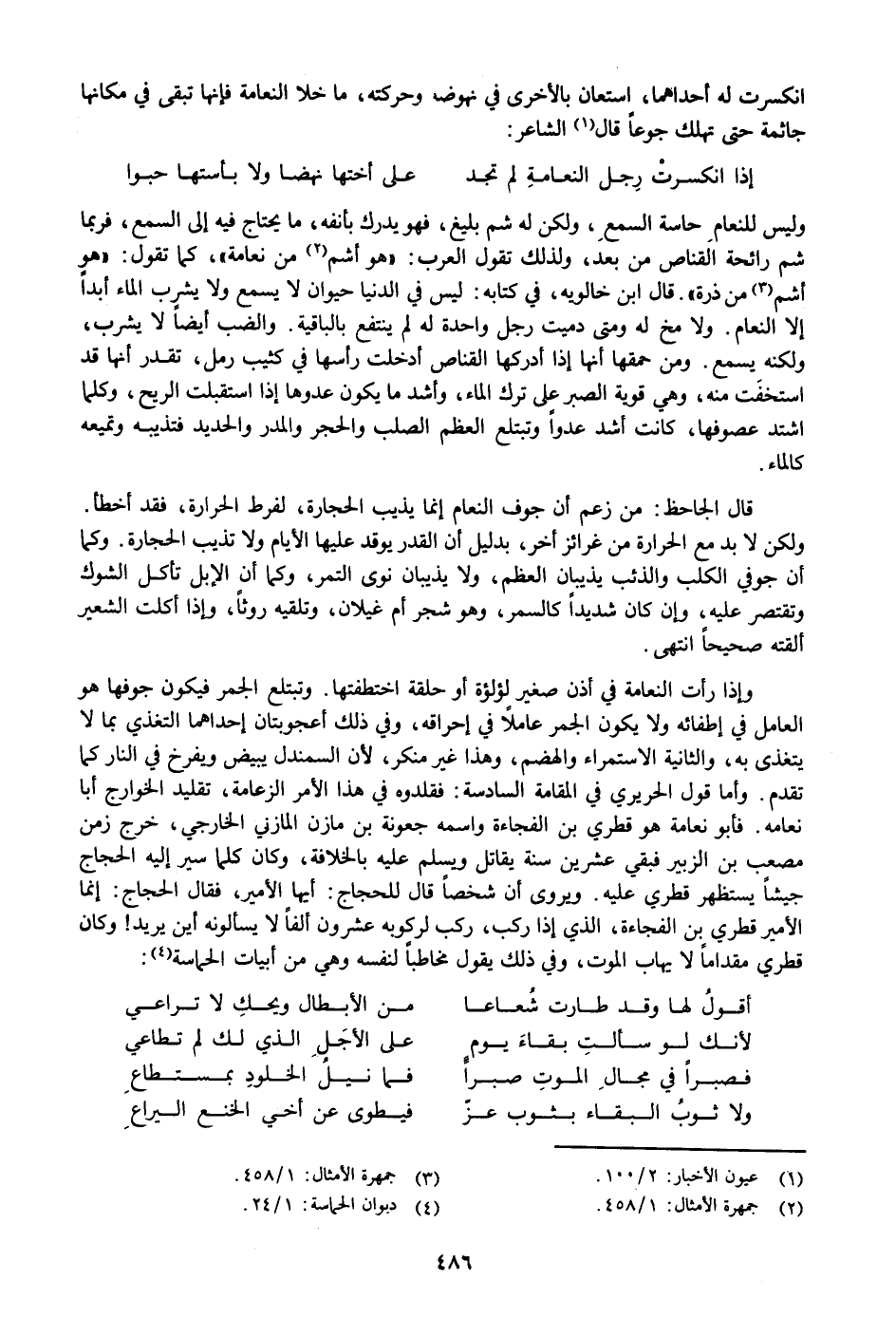 وإذا رأت النعامة في أذن صغير لؤلؤة أو حلقة اختطفتها. وتبتلع الجمر فيكون جوفها هو العامل في إطفائه ولا يكون الجمر عاملا في إحراقه، وفي ذلك أعجوبتان إحداهما التغذي بما لا يتغذى به، والثانية الاستمراء والهضم، وهذا غير منكر، لأن السمندل يبيض ويفرخ في النار كما تقدم. وأما قول الحريري في المقامة السادسة: فقلدوه في هذا الأمر الزعامة، تقليد الخوارج أبا نعامه. فأبو نعامة هو قطري بن الفجاءة واسمه جعونة بن مازن المازني الخارجي، خرج زمن مصعب بن الزبير فبقي عشرين سنة يقاتل ويسلم عليه بالخلافة، وكان كلما سير إليه الحجاج جيشا يستظهر قطري عليه. ويروى أن شخصا قال للحجاج: أيها الأمير، فقال الحجاج: إنما الأمير قطري بن الفجاءة، الذي إذا ركب، ركب لركوبه عشرون ألفا لا يسألونه أين يريد! وكان قطري مقداما لا يهاب الموت، وفي ذلك يقول مخاطبا لنفسه وهي من أبيات الحماسة «4» :
