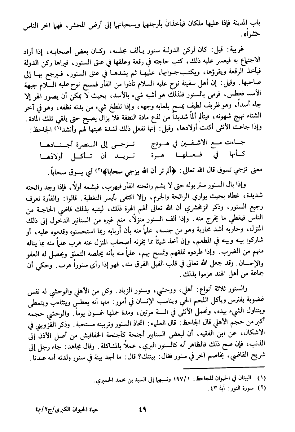 والسنور ثلاثة أنواع: أهلي، ووحشي، وسنور الزباد. وكل من الأهلي والوحشي له نفس غضوبة يفترس ويأكل اللحم الحي ويناسب الإنسان في أمور: منها أنه يعطس ويتثاءب ويتمطى ويتناول الشيء بيده، وتحمل الأنثى في السنة مرتين، ومدة حملها خمسون يوما. والوحشي حجمه أكبر من حجم الأهلي قال الجاحظ: قال العلماء: اتخاذ السنور وتربيته مستحبة. وذكر القزويني في الاشكال، عن ابن الفقيه، أن لبعض السنابير أجنحة كأجنحة الخفافيش من أصل الأذن إلى الذنب، فإن صح ذلك فالظاهر أنه كالسنور البري، عملا بالمشاكلة. وقال مجاهد: جاء رجل إلى شريح القاضي، يخاصم آخر في سنور فقال: بينتك؟ قال: ما أجد بينة في سنور ولدته أمه عندنا.