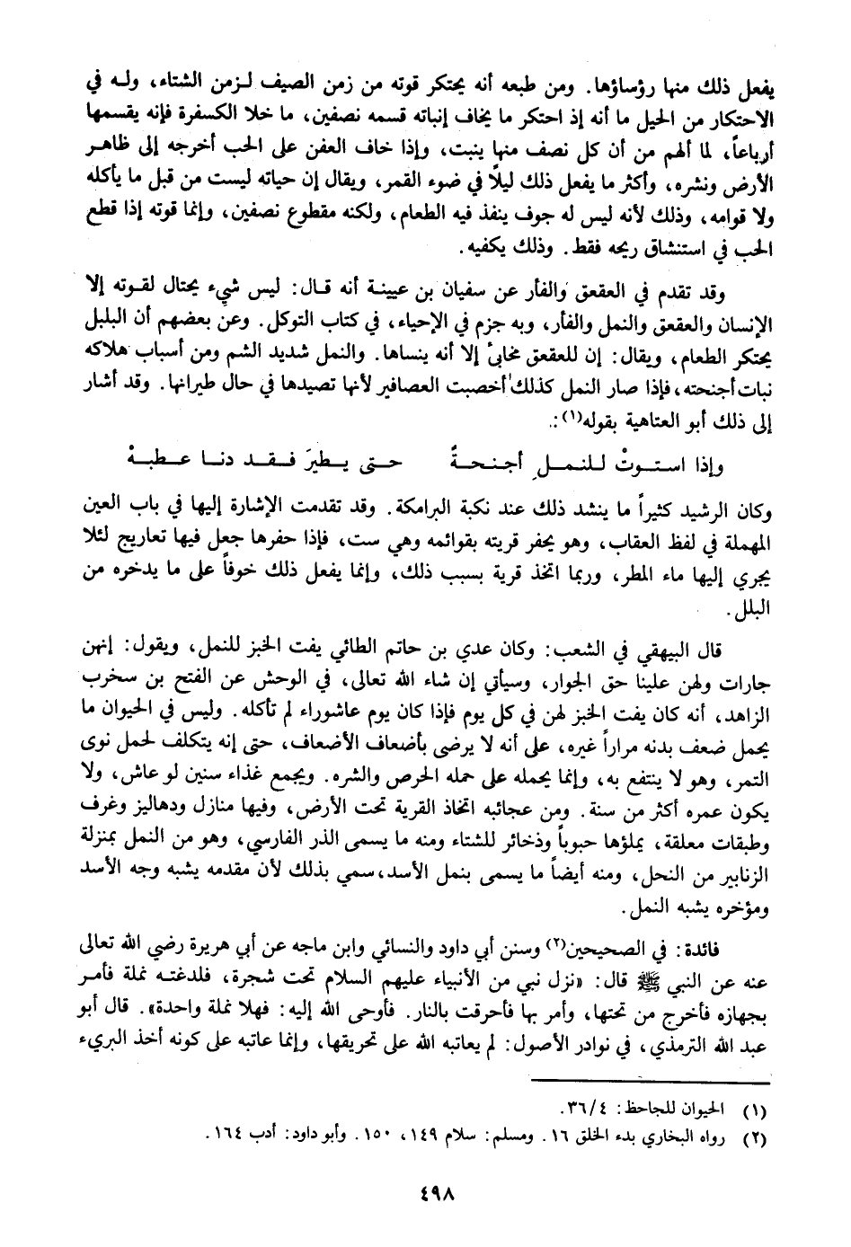 وقد تقدم في العقعق والفأر عن سفيان بن عيينة أنه قال: ليس شيء يحتال لقوته إلا الإنسان والعقعق والنمل والفأر، وبه جزم في الإحياء، في كتاب التوكل. وعن بعضهم أن البلبل يحتكر الطعام، ويقال: إن للعقعق مخابئ إلا أنه ينساها. والنمل شديد الشم ومن أسباب هلاكه نبات أجنحته، فإذا صار النمل كذلك أخصبت العصافير لأنها تصيدها في حال طيرانها. وقد أشار إلى ذلك أبو العتاهية بقوله «1» :