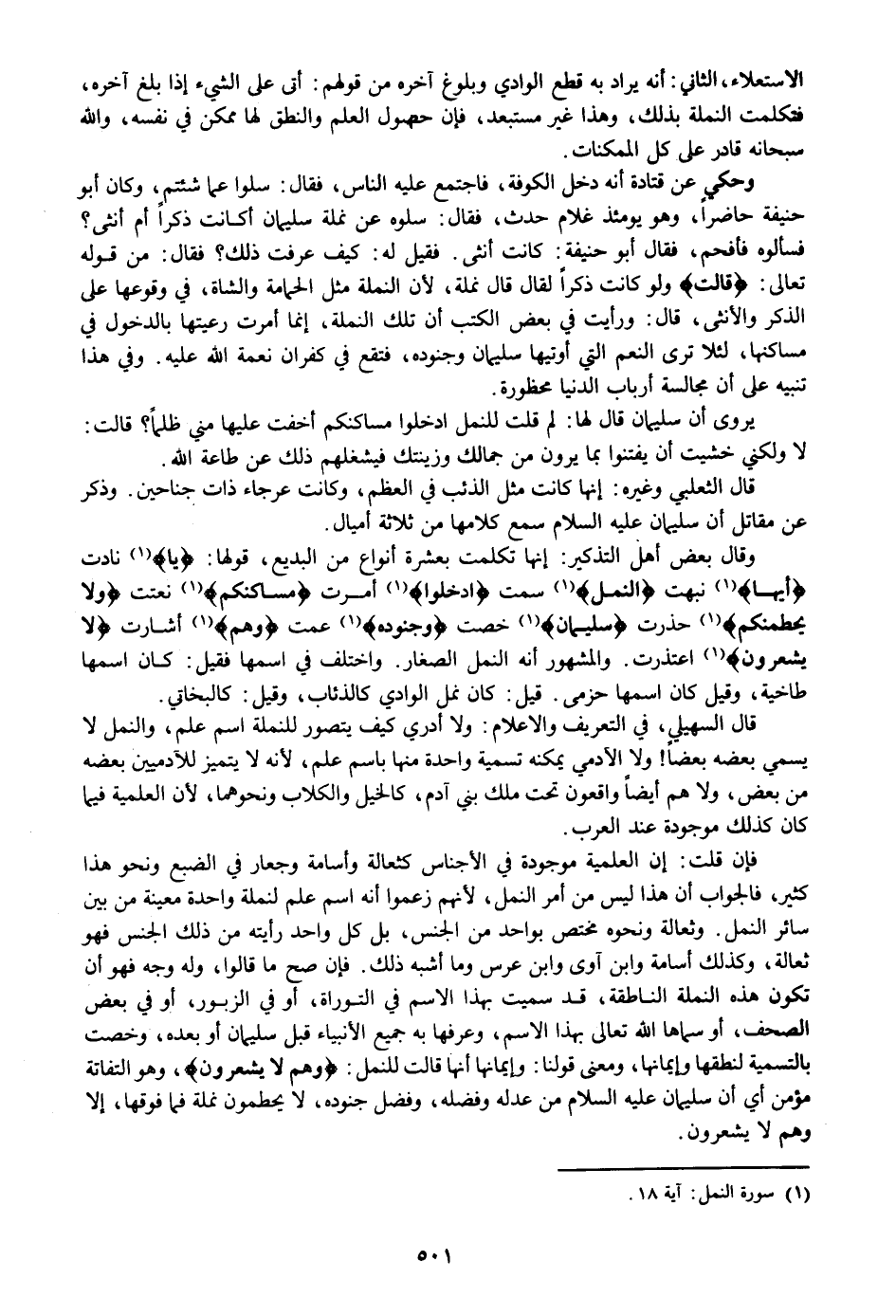 فإن قلت: إن العلمية موجودة في الأجناس كثعالة وأسامة وجعار في الضبع ونحو هذا كثير، فالجواب أن هذا ليس من أمر النمل، لأنهم زعموا أنه اسم علم لنملة واحدة معينة من بين سائر النمل. وثعالة ونحوه مختص بواحد من الجنس، بل كل واحد رأيته من ذلك الجنس فهو ثعالة، وكذلك أسامة وابن آوى وابن عرس وما أشبه ذلك. فإن صح ما قالوا، وله وجه فهو أن تكون هذه النملة الناطقة، قد سميت بهذا الاسم في التوراة، أو في الزبور، أو في بعض الصحف، أو سماها الله تعالى بهذا الاسم، وعرفها به جميع الأنبياء قبل سليمان أو بعده، وخصت بالتسمية لنطقها وإيمانها، ومعنى قولنا: وإيمانها أنها قالت للنمل: وَهُمْ لا يَشْعُرُونَ