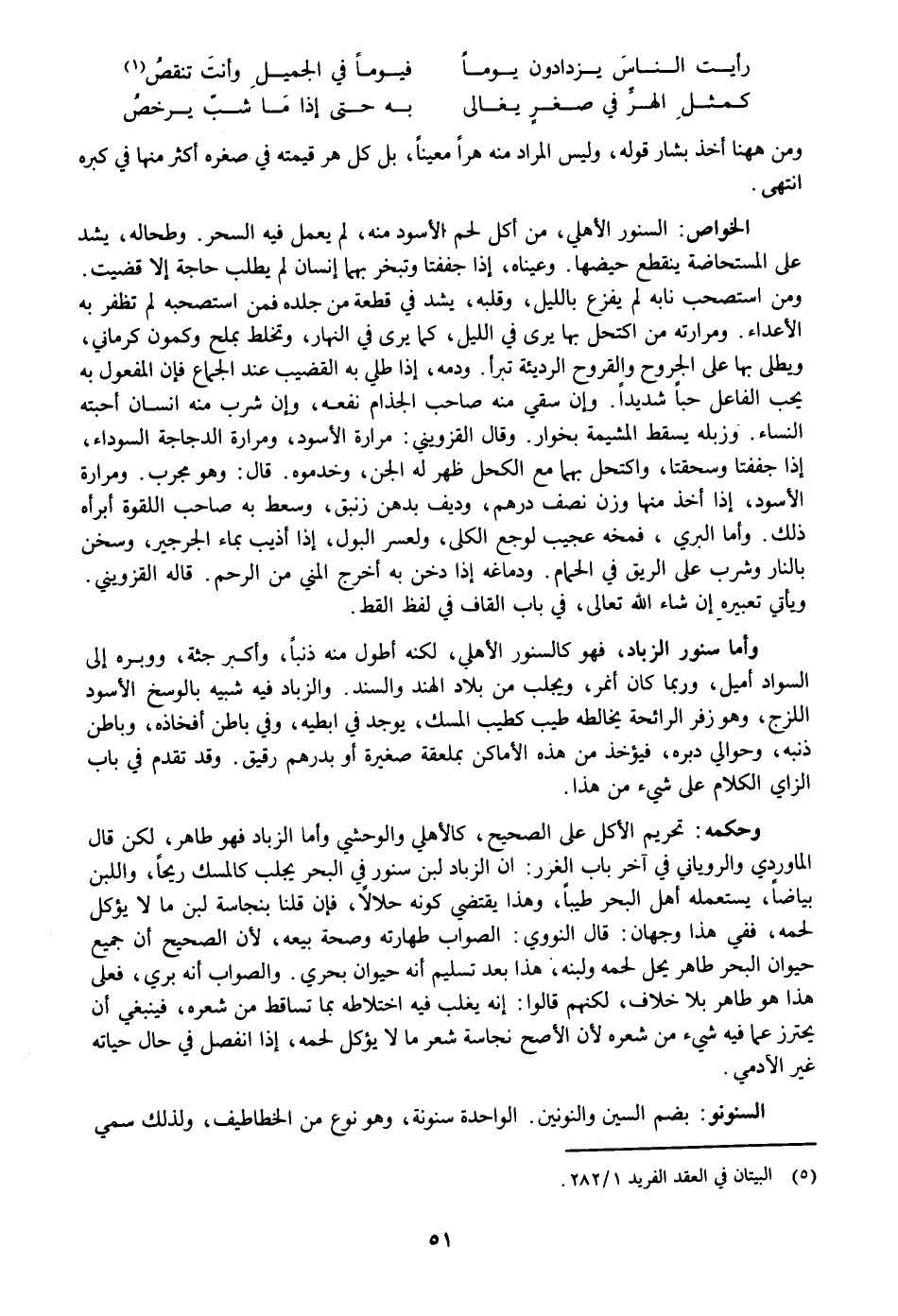 : تحريم الأكل على الصحيح، كالأهلي والوحشي وأما الزباد فهو طاهر، لكن قال الماوردي والروياني في آخر باب الغرر: ان الزباد لبن سنور في البحر يجلب كالمسك ريحا، واللبن بياضا، يستعمله أهل البحر طيبا، وهذا يقتضي كونه حلالا، فإن قلنا بنجاسة لبن ما لا يؤكل لحمه، ففي هذا وجهان: قال النووي: الصواب طهارته وصحة بيعه، لأن الصحيح أن جميع حيوان البحر طاهر يحل لحمه ولبنه، هذا بعد تسليم أنه حيوان بحري. والصواب أنه بري، فعلى هذا هو طاهر بلا خلاف، لكنهم قالوا: إنه يغلب فيه اختلاطه بما تساقط من شعره، فينبغي أن يحترز عما فيه شيء من شعره لأن الأصح نجاسة شعر ما لا يؤكل لحمه، إذا انفصل في حال حياته غير الآدمي.