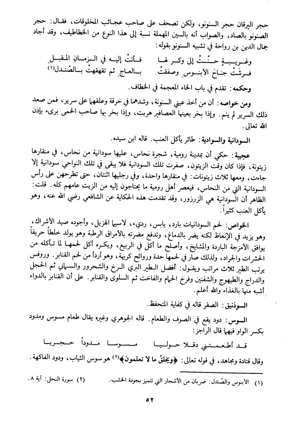 : لحم السودانيات بارد، يابس، رديء، لا سيما الهزيل، وأجوده صيد الأشراك، وهو يزيد في الإنعاظ لكنه يضر بالدماغ، وتدفع مضرته بالأمراق الرطبة وهو يولد خلطا حريفا يوافق الأمزجة الباردة والمشايخ، وأصلح ما أكل في الربيع، ويكره أكل لحمها لما تأكله من الحشرات والجراد، ولذلك صار في لحمها حدة وروائح كريهة، وهو أردأ من لحم القنابر. وروفس يرتب الطير ثلاث مراتب ويقول: أفضل الطير البري الرخ والشحرور والسماني ثم الحجل والدراج والطيهوج والشفنين وفرخ الحمام والفاخت ثم السلوى والقنابر. على أن القنابر بالدواء أشبه منها بالغذاء والله أعلم.