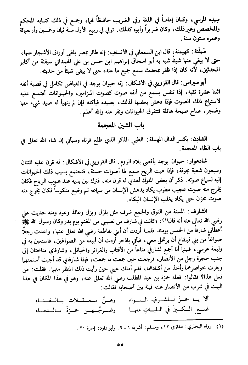 المسنة من النوق والجمع شرف مثل بازل وبزل وعائذ وعوذ ومنه حديث علي رضي الله تعالى عنه أنه قال «1» : «كانت لي شارف من نصيبي من المغنم يوم بدر وكان رسول الله صلى الله عليه وسلم أعطاني شارفا من الخمس يومئذ فلما أردت أن أبني بفاطمة رضي الله تعالى عنها، واعدت رجلا صواغا من بني قينقاع أن يرتحل معي، فيأتي باذخر أردت أن أبيعه من الصواغين، فاستعين به في وليمة عرسي، فبينما أنا أجمع لشارفي متاعا من الأقتاب والغرائر والحبائل، وشارفاي مناختان إلى جنب حجرة رجل من الأنصار، فرجعت حين جمعت ما جمعت، فإذا شارفاي قد أجبت أسنمتهما وبقرت خواصر هما وأخذ من أكبادهما، فلم أملك عيني حين رأيت ذلك المنظر منهما. فقلت: من فعل هذا؟ فقالوا: فعله حمزة بن عبد المطلب رضي الله تعالى عنه، وهو في هذا المكان في هذا البيت في شرب من الأنصار غنته قينة بين أصحابه فقالت: