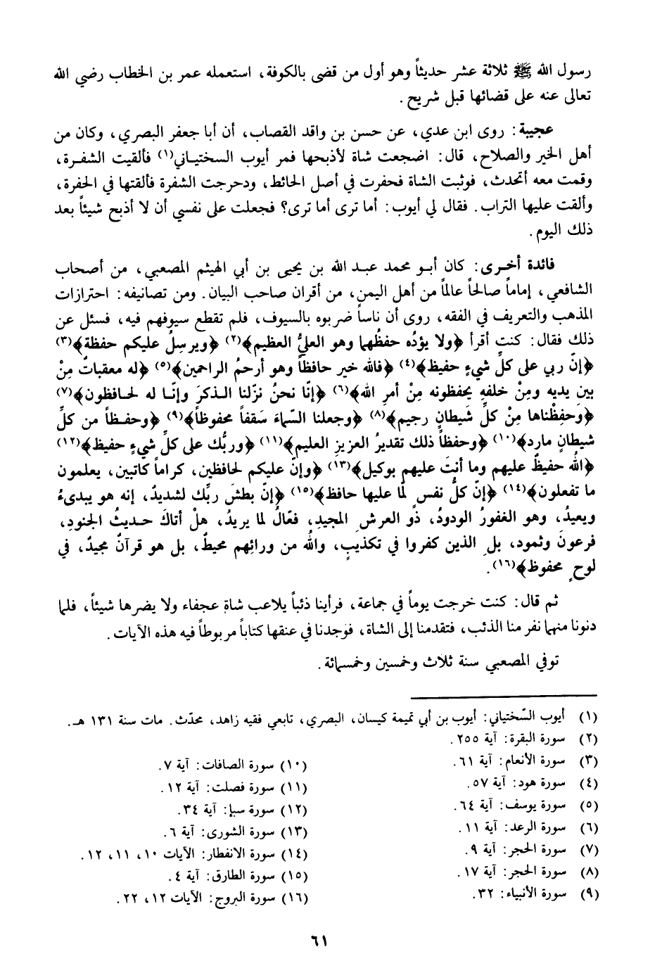 ثم قال: كنت خرجت يوما في جماعة، فرأينا ذئبا يلاعب شاة عجفاء ولا يضرها شيئا، فلما دنونا منهما نفر منا الذئب، فتقدمنا إلى الشاة، فوجدنا في عنقها كتابا مربوطا فيه هذه الآيات.