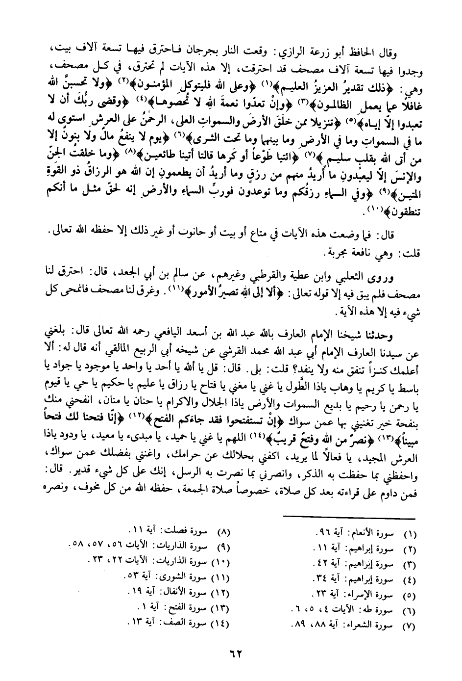 وقال الحافظ أبو زرعة الرازي: وقعت النار بجرجان فاحترق فيها تسعة آلاف بيت، وجدوا فيها تسعة آلاف مصحف قد احترقت، إلا هذه الآيات لم تحترق، في كل مصحف، وهي: ذلِكَ تَقْدِيرُ الْعَزِيزِ الْعَلِيمِ*