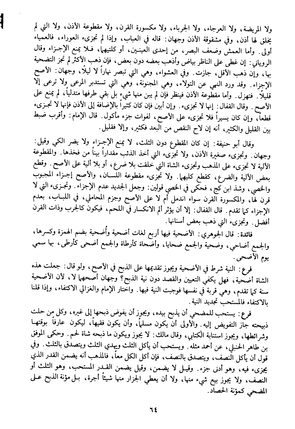 : يستحب للمضحي أن يذبح بيده، ويجوز أن يفوض ذبحها إلى غيره، وكل من حلت ذبيحته جاز التفويض إليه. والأولى أن يكون مسلما، وأن يكون فقيها، ليكون عارفا بوقتها وشرائطها، ويجوز استنابة الكتابي، وقال مالك: لا يجوز ويكون ما ذبحه شاة لحم. وحكى الموفق بن طاهر الحنبلي، عن أحمد مثله. ويستحب أن يأكل الثلث ويهدي الثلث ويتصدق بالثلث. وفي قول أن يأكل النصف، ويتصدق بالنصف، فإن أكل الكل معا، فالمذهب أنه يضمن القدر الذي يجزىء فيه، وهو أدنى جزء. وقيل لا يضمن، وقيل يضمن القدر المستحب، وهو الثلث أو النصف، ولا يجوز بيع شيء منها، ولا أن يعطي الجزار منها شيئا أجرة، بل مؤنة الذبح على المضحي كمؤنة الحصاد.
