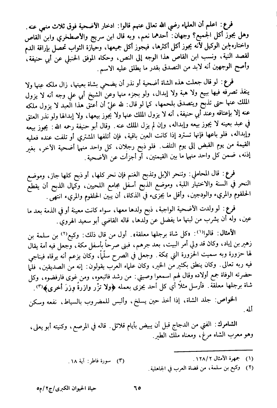 : لو قال جعلت هذه الشاة أضحية أو نذر أن يضحي بشاة بعينها، زال ملكه عنها ولا ينفذ تصرفه فيها ببيع ولا هبة ولا إبدال، ولو بجزء منها وعن الشيخ أبي علي وجه أنه لا يزول الملك عنها حتى تذبح ويتصدق بلحمها، كما لو قال: لله عليّ أن أعتق هذا العبد لا يزول ملكه عنه إلا بإعتاقه وعند أبي حنيفة، أنه لا يزول الملك عنها ولا يجوز بيعها، ولا إبدالها ولو نذر العتق في عبد بعينه لا يجوز بيعه وإبداله، وإن لم يزل الملك عنه. وقال أبو حنيفة رحمه الله: يجوز بيعه وإبداله، فلو باعها فإنها تسترد إذا كانت العين باقية، فإن أتلفها المشتري أو تلفت عنده فعليه القيمة من يوم القبض إلى يوم التلف. فلو ذبح رجلان، كل واحد منهما أضحية الآخر، بغير إذنه، ضمن كل واحد منهما ما بين القيمتين، أو أجزأت عن الأضحية.